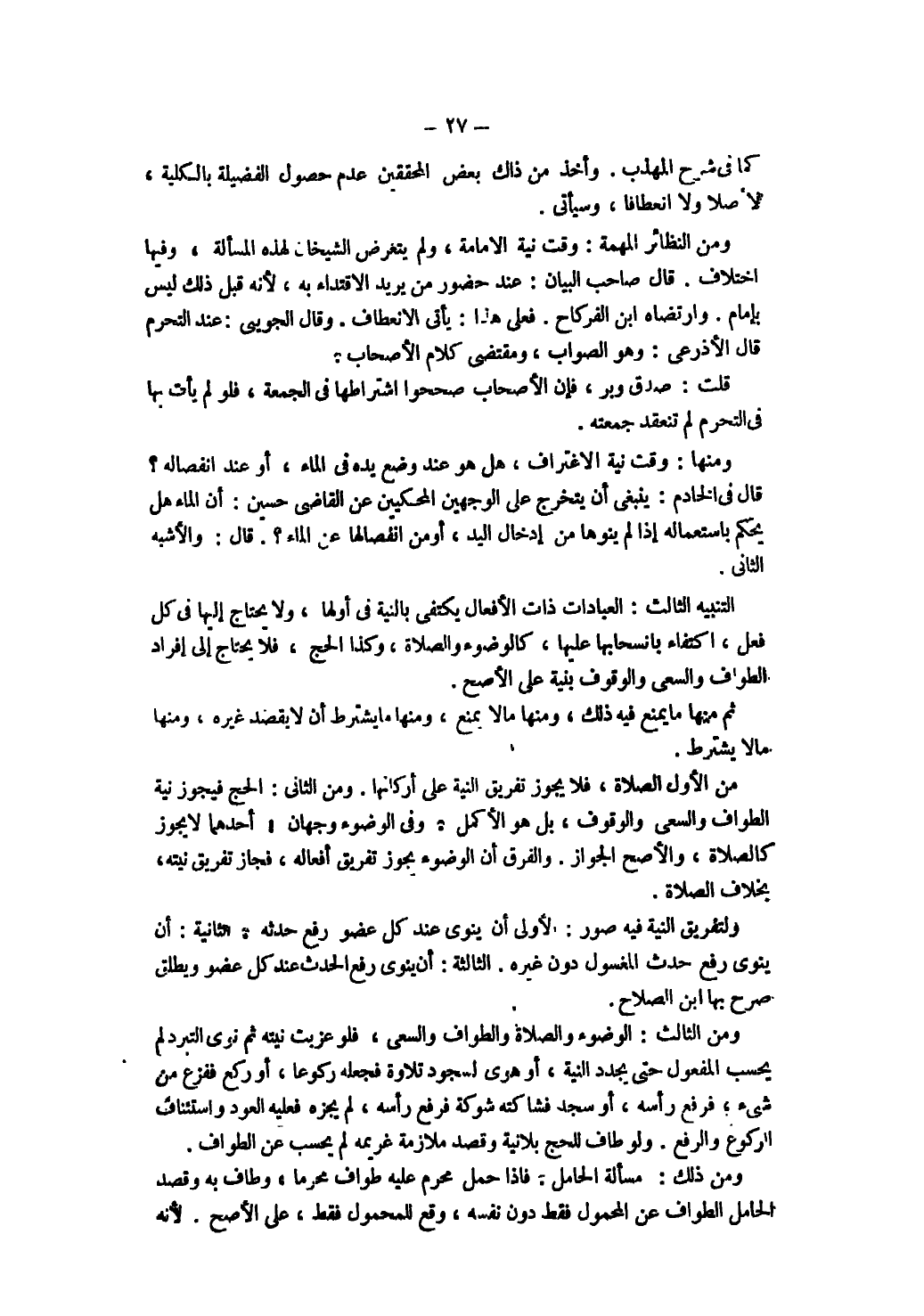 التَّنْبِيه الثَّالِث: الْعِبَادَات ذَات الْأَفْعَال يُكْتَفَى بِالنِّيَّةِ فِي أَوَّلهَا، وَلَا يُحْتَاج إلَيْهَا فِي كُلّ فِعْل، اكْتِفَاءً بِانْسِحَابِهَا عَلَيْهَا كَالْوُضُوءِ وَالصَّلَاة، وَكَذَا الْحَجّ، فَلَا يُحْتَاج إلَى إفْرَاد الطَّوَافِ وَالسَّعْي وَالْوُقُوفِ بِنِيَّةٍ عَلَى الْأَصَحِّ.