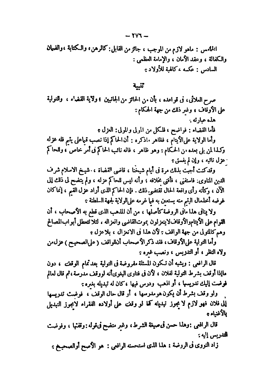 وَأَمَّا التَّوْلِيَةُ عَلَى الْأَوْقَافِ فَقَدْ ذَكَرَ الْأَصْحَابُ أَنَّ لِلْوَاقِفِ (عَلَى الصَّحِيحِ) عَزْلَ مَنْ وَلَّاهُ النَّظَرَ، أَوْ التَّدْرِيسَ، وَنَصْبَ غَيْرِهِ. قَالَ الرَّافِعِيُّ: وَيُشْبِه أَنْ تَكُونَ الْمَسْأَلَةُ مَفْرُوضَةً فِي التَّوْلِيَةِ بَعْدَ تَمَامٍ الْوَقْفِ، دُونَ مَا إذَا أَوْقَفَ بِشَرْطِ التَّوْلِيَةِ لِفُلَانٍ، لِأَنَّ فِي فَتَاوَى الْبَغَوِيِّ أَنَّهُ لَوْ وَقَفَ مَدْرَسَةً، ثُمَّ قَالَ لِعَالِمٍ فَوَّضَتْ إلَيْك تَدْرِيسَهَا، أَوْ اذْهَبْ وَدَرِّسْ فِيهَا، كَانَ لَهُ تَبْدِيلُهُ بِغَيْرِهِ، وَلَوْ وَقَفَ بِشَرْطِ أَنْ يَكُونَ هُوَ مُدَرِّسَهَا، أَوْ قَالَ حَالَ الْوَقْفِ، فَوَّضْت تَدْرِيسَهَا إلَى فُلَانٍ فَهُوَ لَازِمُ لَا يَجُوزُ تَبْدِيلُهُ كَمَا لَوْ وَقَفَ عَلَى أَوْلَادِهِ الْفُقَرَاءِ لَا يَجُوزُ التَّبْدِيلُ بِالْأَغْنِيَاءِ.