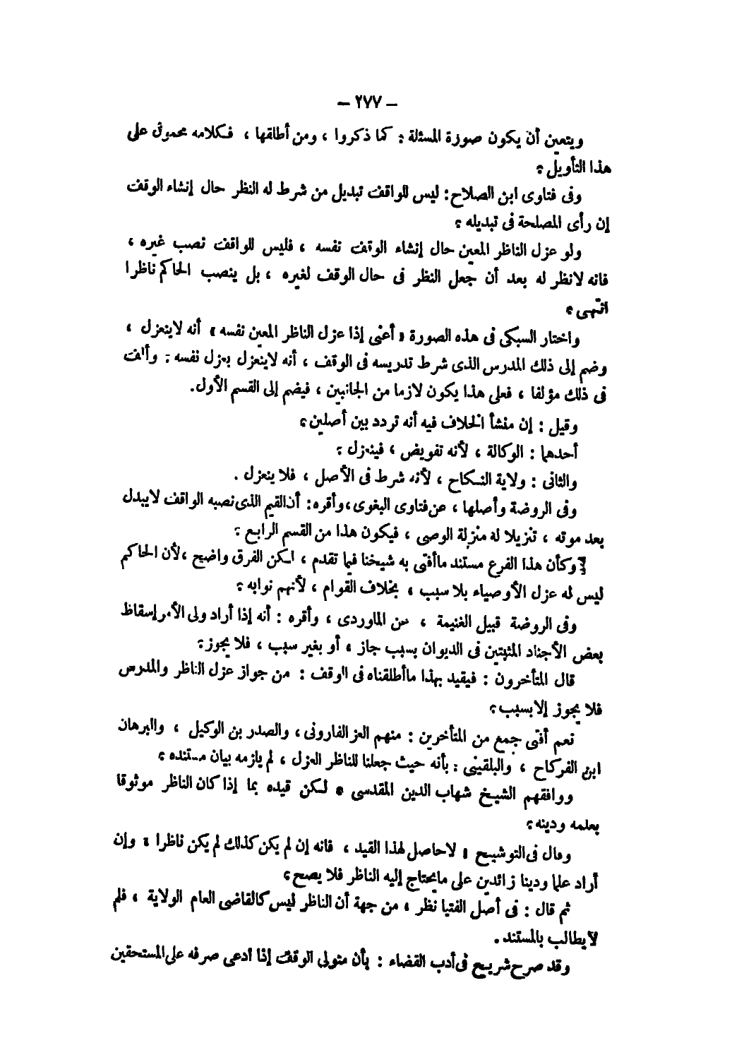 وَفِي الرَّوْضَةِ قُبَيْلَ الْغَنِيمَةِ، عَنْ الْمَاوَرْدِيِّ، وَأَقَرَّهُ: أَنَّهُ إذَا أَرَادَ وَلِيُّ الْأَمْرِ إسْقَاطَ بَعْضِ الْأَجْنَادِ الْمُثْبَتِينَ فِي الدِّيوَانِ بِسَبَبٍ جَازَ، أَوْ بِغَيْرِ سَبَبٍ فَلَا يَجُوزُ. قَالَ الْمُتَأَخِّرُونَ: فَيُقَيَّد بِهَذَا مَا أَطْلَقْنَاهُ فِي الْوَقْفِ: مِنْ جَوَازِ عَزْلِ النَّاظِرِ وَالْمُدَرِّسِ فَلَا يَجُوزُ إلَّا بِسَبَبٍ. نَعَمْ أَفْتَى جَمْعٌ مِنْ الْمُتَأَخِّرِينَ: مِنْهُمْ الْعِزُّ الْفَارُونِيُّ، وَالصَّدْرُ بْنُ الْوَكِيلِ وَالْبُرْهَانُ ابْنُ الْفِرْكَاحِ، وَالْبُلْقِينِيُّ، بِأَنَّهُ حَيْثُ جَعَلْنَا لِلنَّاظِرِ الْعَزْلَ، لَمْ يَلْزَمْهُ بَيَانُ مُسْتَنَدِهِ. وَوَافَقَهُمْ الشَّيْخُ شِهَابُ الدِّين الْمَقْدِسِيُّ، لَكِنْ قَيَّدَهُ بِمَا إذَا كَانَ النَّاظِرُ مَوْثُوقًا بِعِلْمِهِ وَدِينِهِ.