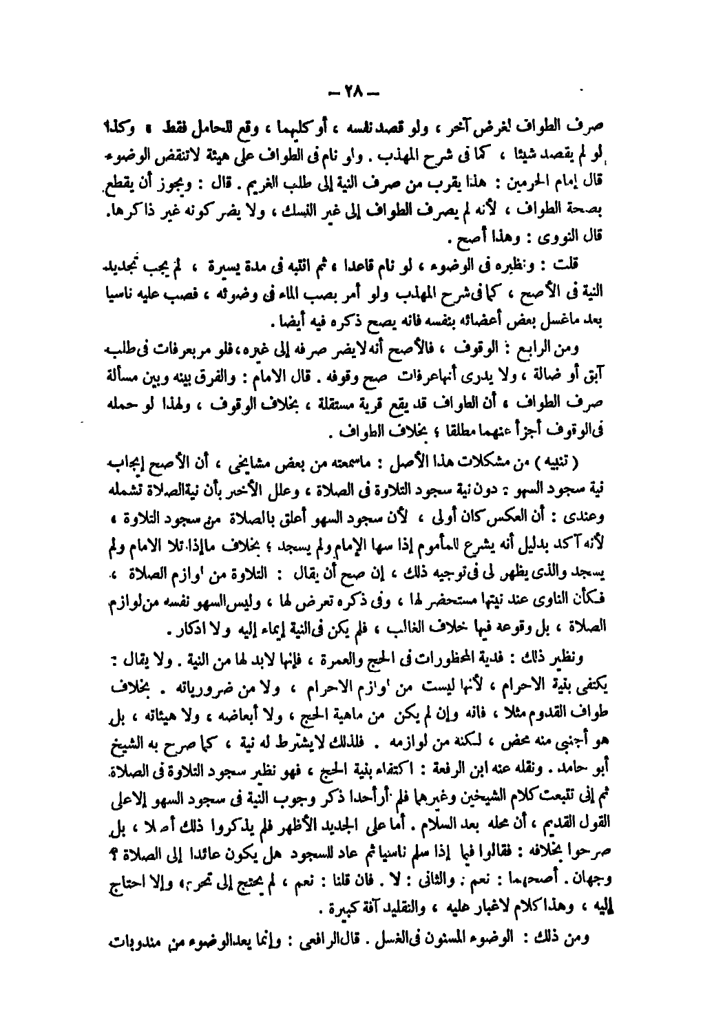 مِنْ مُشْكِلَات هَذَا الْأَصْل: مَا سَمِعْته مِنْ بَعْض مَشَايِخِي، أَنَّ الْأَصَحّ إيجَاب نِيَّة سُجُود السَّهْو دُون نِيَّة سُجُود التِّلَاوَة فِي الصَّلَاة، وَعُلِّلَ الْأَخِير بِأَنَّ نِيَّة الصَّلَاة تَشْمَلهُ، وَعِنْدِي: أَنَّ الْعَكْس كَانَ أَوْلَى ; لِأَنَّ سُجُود السَّهْو أَعْلَق بِالصَّلَاةِ مِنْ سُجُود التِّلَاوَة ; لِأَنَّهُ آكَدُ، بِدَلِيلِ أَنَّهُ يُشْرَعُ لِلْمَأْمُومِ إذَا سَهَا الْإِمَام وَلَمْ يَسْجُد ; بِخِلَافِ مَا إذَا تَلَا الْإِمَام وَلَمْ يَسْجُدْ، وَاَلَّذِي يَظْهَرُ لِي فِي تَوْجِيهِ ذَلِكَ، إنْ صَحَّ أَنْ يُقَالَ: التِّلَاوَةُ مِنْ لَوَازِمِ الصَّلَاةِ، فَكَأَنَّ النَّاوِي عِنْد نِيَّتهَا مُسْتَحْضِر لَهَا، وَفِي ذِكْرِهِ تَعَرُّضٌ لَهَا، وَلَيْسَ السَّهْو نَفْسه مِنْ لَوَازِم الصَّلَاة، بَلْ وُقُوعه فِيهَا خِلَاف الْغَالِب، فَلَمْ يَكُنْ فِي النِّيَّة إيمَاء إلَيْهِ وَلَا ادِّكَارٌ.