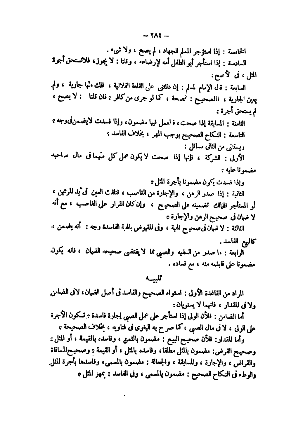تَنْبِيهٌ: الْمُرَادُ مِنْ الْقَاعِدَةِ الْأُولَى: اسْتِوَاءُ الصَّحِيحِ وَالْفَاسِدِ فِي أَصْلِ الضَّمَانِ، لَا فِي الضَّامِنِ وَلَا فِي الْمِقْدَارِ، فَإِنَّهُمَا لَا يَسْتَوِيَانِ. أَمَّا الضَّامِنُ: فَلِأَنَّ الْوَلِيَّ إذَا اسْتَأْجَرَ عَلَى عَمَلٍ لِلصَّبِيِّ إجَارَةً فَاسِدَةً. تَكُونُ الْأُجْرَةُ عَلَى الْوَلِيِّ، لَا فِي مَالِ الصَّبِيِّ، كَمَا صَرَّحَ بِهِ الْبَغَوِيّ فِي فَتَاوِيه، بِخِلَافِ الصَّحِيحَةِ. وَأَمَّا الْمِقْدَارُ: فَلِأَنَّ صَحِيحَ الْبَيْعِ: مَضْمُونٌ بِالثَّمَنِ، وَفَاسِدُهُ بِالْقِيمَةِ، أَوْ الْمِثْلِ: وَصَحِيحُ الْقَرْضِ: مَضْمُونٌ بِالْمِثْلِ مُطْلَقًا، وَفَاسِدُهُ بِالْمِثْلِ، أَوْ الْقِيمَةِ.