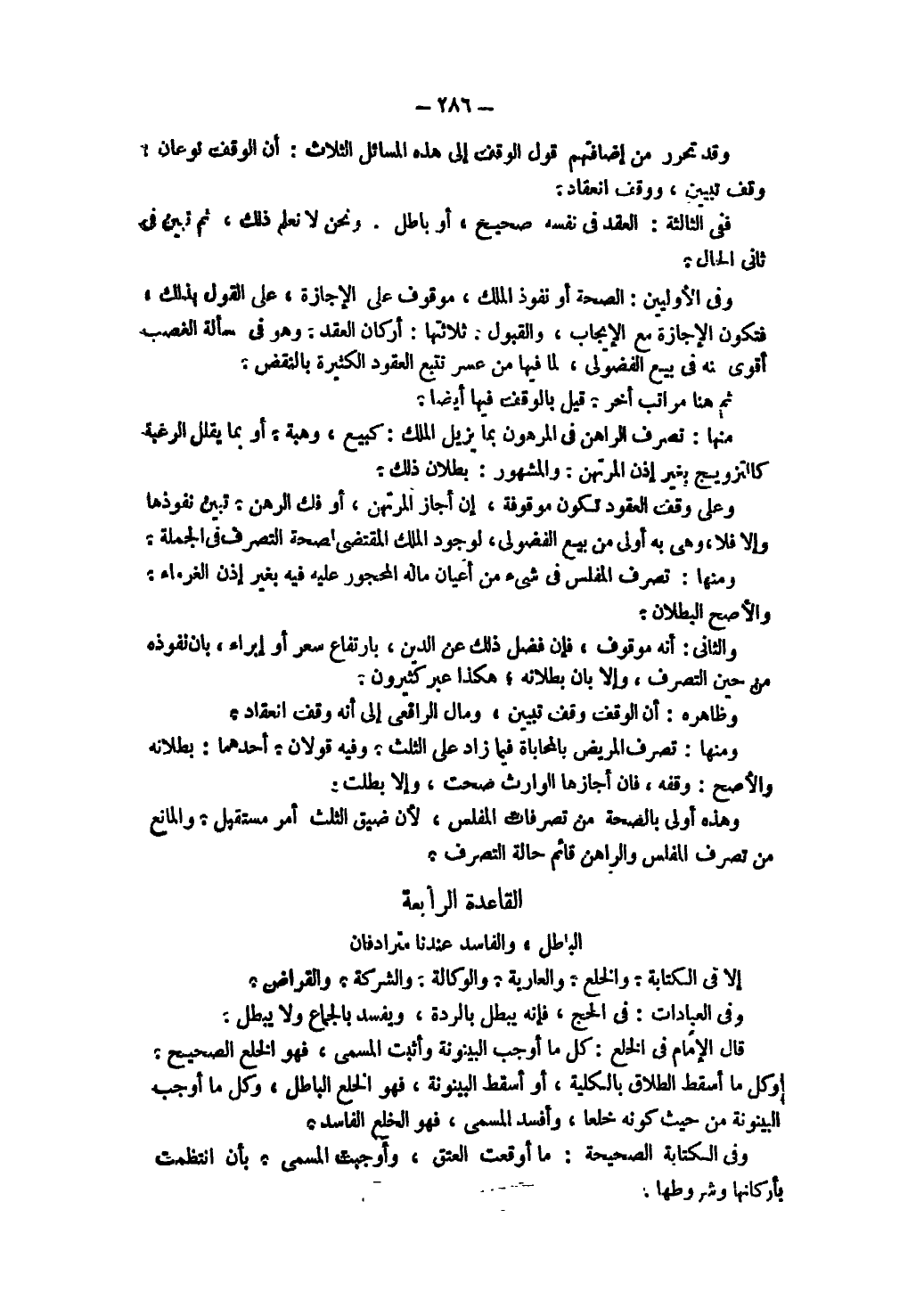 الْقَاعِدَةُ الرَّابِعَةُ الْبَاطِلُ، وَالْفَاسِدُ عِنْدنَا مُتَرَادِفَانِ إلَّا فِي الْكِتَابَةِ وَالْخُلْعِ، وَالْعَارِيَّةِ، وَالْوَكَالَةِ، وَالشَّرِكَةِ، وَالْقِرَاضِ، وَفِي الْعِبَادَاتِ: فِي الْحَجِّ، فَإِنَّهُ يَبْطُلُ بِالرِّدَّةِ، وَيَفْسُدُ بِالْجِمَاعِ وَلَا يَبْطُلُ. قَالَ الْإِمَامُ فِي الْخُلْعِ: كُلُّ مَا أَوْجَبَ الْبَيْنُونَةَ وَأَثْبَتَ الْمُسَمَّى، فَهُوَ الْخُلْع الصَّحِيحِ. وَكُلُّ مَا أَسْقَطَ الطَّلَاقَ بِالْكُلِّيَّةِ، أَوْ أَسْقَطَ الْبَيْنُونَةَ، فَهُوَ الْخُلْع الْبَاطِلِ، وَكُلُّ مَا أَوْجَبَ الْبَيْنُونَةَ مِنْ حَيْثُ كَوْنُهُ خُلْعًا، وَأَفْسَدَ الْمُسَمَّى، فَهُوَ الْخُلْعُ الْفَاسِد.
