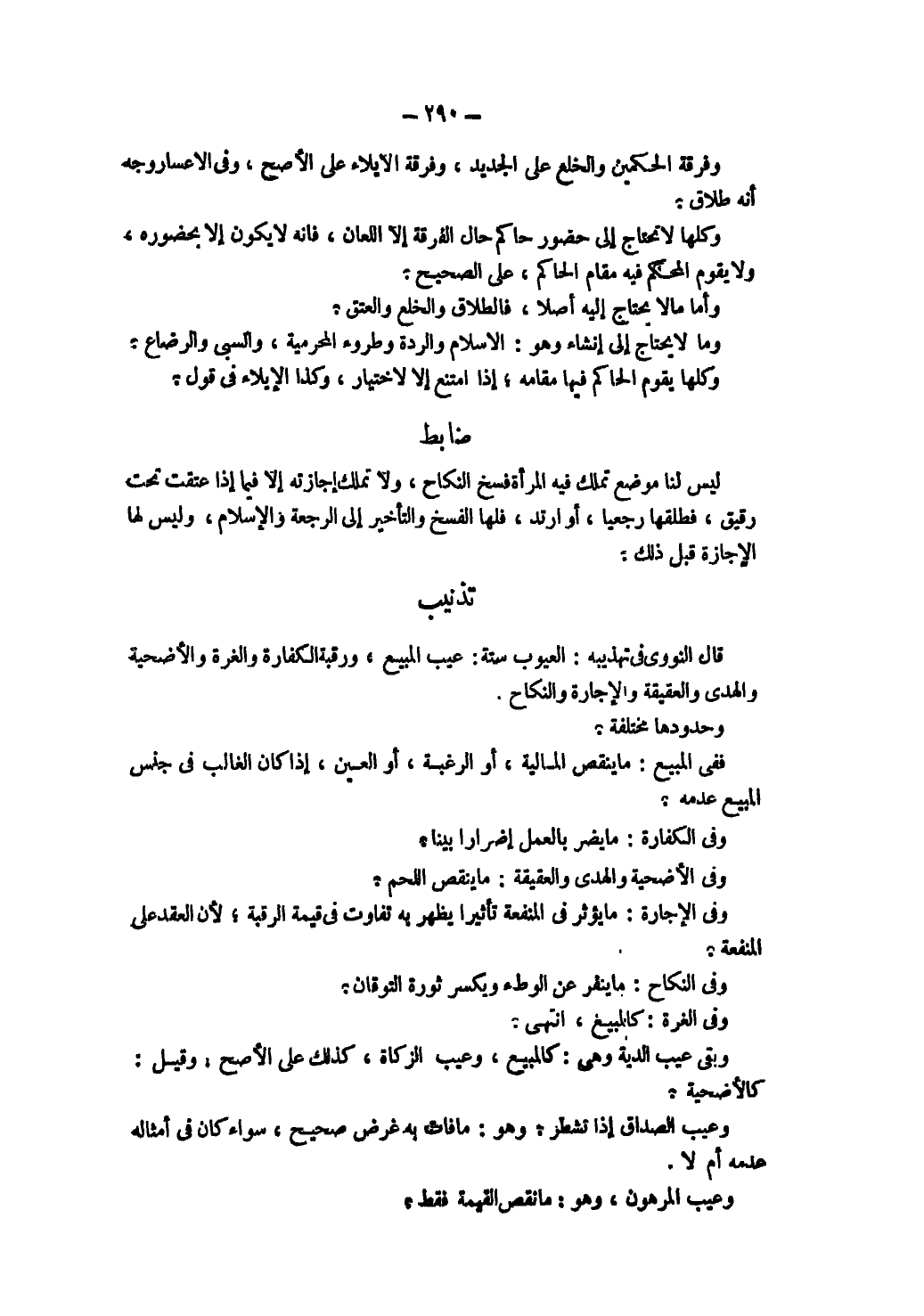 تَذْنِيب قَالَ النَّوَوِيُّ فِي تَهْذِيبِهِ: الْعُيُوب سِتَّةٌ: عَيْبُ الْمَبِيعِ، وَرَقَبَةِ الْكَفَّارَةِ وَالْغُرَّةِ وَالْأُضْحِيَّةِ وَالْهَدْيِ وَالْعَقِيقَةِ وَالْإِجَارَةِ وَالنِّكَاحِ. وَحُدُودُهَا مُخْتَلِفَةٌ فَفِي الْمَبِيعِ: مَا يُنْقِصُ الْمَالِيَّةَ، أَوْ الرَّغْبَةَ، أَوْ الْعَيْنَ، إذَا كَانَ الْغَالِبُ فِي جِنْسِ الْمَبِيعِ عَدَمَهُ. وَفِي الْكَفَّارَةِ: مَا يَضُرُّ بِالْعَمَلِ إضْرَارًا بَيِّنًا وَفِي الْأُضْحِيَّةِ وَالْهَدْيِ وَالْعَقِيقَةِ: مَا يُنْقِضُ اللَّحْمَ وَفِي الْإِجَارَةِ: مَا يُؤَثِّرُ فِي الْمَنْفَعَةِ تَأْثِيرًا يَظْهَرُ بِهِ تَفَاوُتٌ فِي قِيمَةِ الرَّقَبَةِ ; لِأَنَّ الْعَقْدَ عَلَى الْمَنْفَعَةِ وَفِي النِّكَاحِ: مَا يُنَفِّرُ عَنْ الْوَطْءِ وَيَكْسِرُ ثَوْرَةَ التَّوَقَانِ.