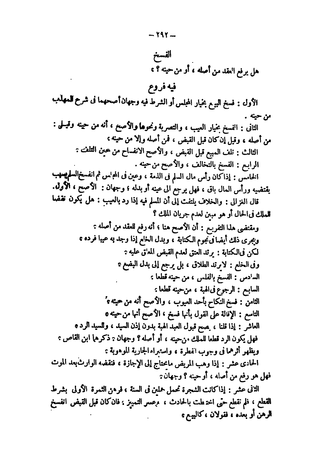 الْفَسْخُ هَلْ يَرْفَعُ الْعَقْدَ مِنْ أَصْلِهِ أَوْ مِنْ حِينِهِ فِيهِ فُرُوعٌ الْأَوَّل: فَسْخُ الْبَيْعِ بِخِيَارِ الْمَجْلِسِ أَوْ الشَّرْطِ فِيهِ وَجْهَانِ أَصَحّهمَا فِي شَرْحِ الْمُهَذَّبِ مِنْ حِينِهِ.