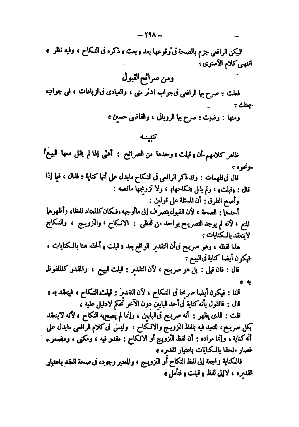 هَذَا لَفْظُهُ، وَهُوَ صَرِيحٌ فِي أَنَّ التَّقْدِيرَ الْوَاقِعَ بَعْدَ " قَبِلْت " أَلْحَقَهُ هُنَا بِالْكِنَايَاتِ، فَيَكُون أَيْضًا كِنَايَةً فِي الْبَيْعِ. قَالَ: فَإِنْ قِيلَ: بَلْ هُوَ صَرِيحٌ لِأَنَّ التَّقْدِيرَ: قَبِلْت الْبَيْعَ وَالْمُقَدَّرُ كَالْمَلْفُوظِ بِهِ. قُلْنَا: فَيَكُونُ أَيْضًا صَرِيحًا فِي النِّكَاحِ ; لِأَنَّ التَّقْدِيرَ: قَبِلْت النِّكَاحَ، فَيَنْعَقِدُ بِهِ. قَالَ: فَالْقَوْلُ بِأَنَّهُ كِنَايَةٌ فِي أَحَدِ الْبَابَيْنِ دُونَ الْآخَرِ تَحَكُّمٌ لَا دَلِيلَ عَلَيْهِ.