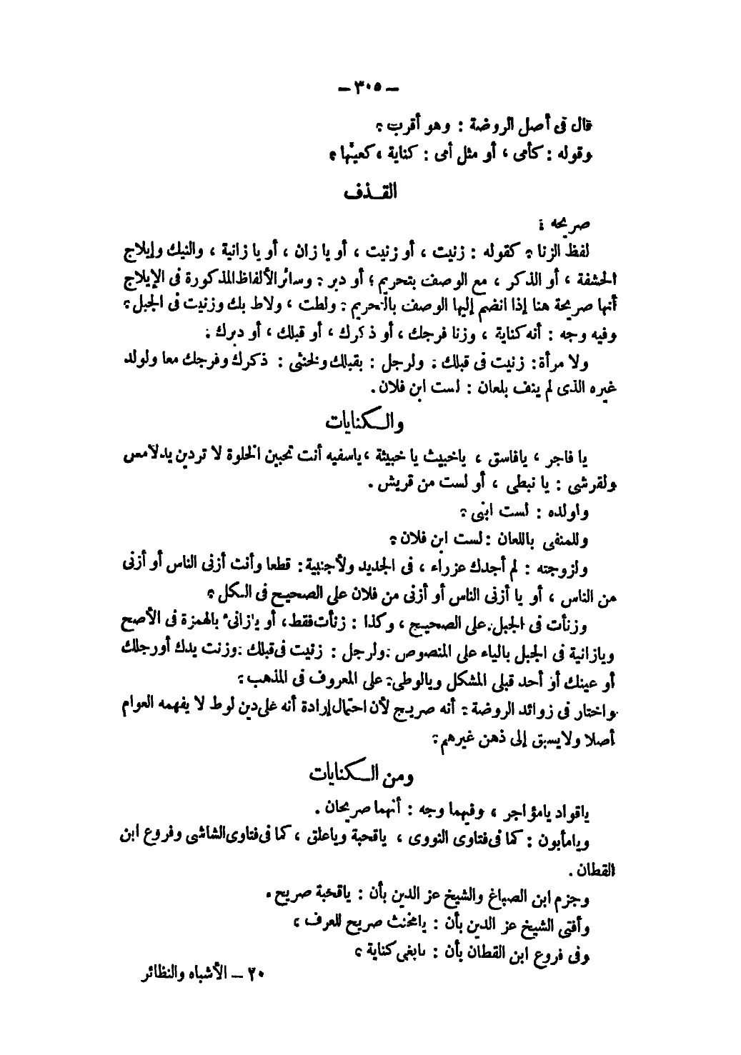 وَفِيهِ وَجْهٌ: أَنَّهُ كِنَايَةٌ، وَزَنَا فَرْجُك، أَوْ ذَكَرُك، أَوْ قُبُلُك، أَوْ دُبُرُك. وَلَامْرَأَةٍ: زَنَيْت فِي قُبُلِك. وَلِرَجُلٍ: بِقُبُلِك وَلِخُنْثَى: ذَكَرُك وَفَرْجُك مَعًا وَلِوَلَدِ غَيْرِهِ الَّذِي لَمْ يُنْفَ بِلِعَانٍ: لَسْت ابْنَ فُلَانٍ. وَالْكِنَايَاتُ يَا فَاجِرُ، يَا فَاسِقُ، يَا خَبِيثُ يَا خَبِيثَةُ، يَا سَفِيهُ أَنْتِ تُحِبِّينَ الْخَلْوَةَ لَا تَرُدِّينَ يَدَ لَامِسٍ وَلِقُرَشِيٍّ: يَا نَبَطِيُّ، أَوْ لَسْت مِنْ قُرَيْشٍ. وَلِوَلَدِهِ: لَسْت ابْنِي وَلِلْمَنْفِيِّ بِاللِّعَانِ لَسْت ابْنَ فُلَانٍ.