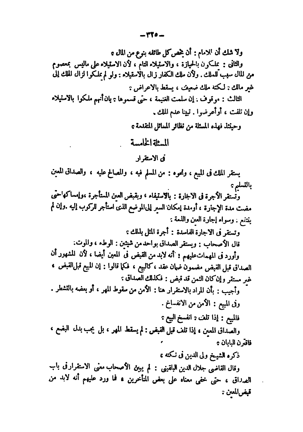 الْمَسْأَلَةُ الْخَامِسَةُ فِي الِاسْتِقْرَارِ يَسْتَقِرُّ الْمِلْكُ فِي الْمَبِيعِ، وَنَحْوِهِ، مِنْ الْمُسْلَمِ فِيهِ، وَالْمُصَالَحِ عَلَيْهِ، وَالصَّدَاقِ الْمُعَيَّنِ بِالتَّسْلِيمِ. وَتَسْتَقِرُّ الْأُجْرَةُ فِي الْإِجَارَةِ: بِالِاسْتِيفَاءِ، وَبِقَبْضِ الْعَيْنِ الْمُسْتَأْجَرَةِ، وَإِمْسَاكِهَا حَتَّى مَضَتْ مُدَّةُ الْإِجَارَةِ أَوْ مُدَّةُ إمْكَانِ السَّيْرِ إلَى الْمَوْضِعِ الَّذِي اسْتَأْجَرَ لِلرُّكُوبِ إلَيْهِ وَإِنْ لَمْ يَنْتَفِعْ.