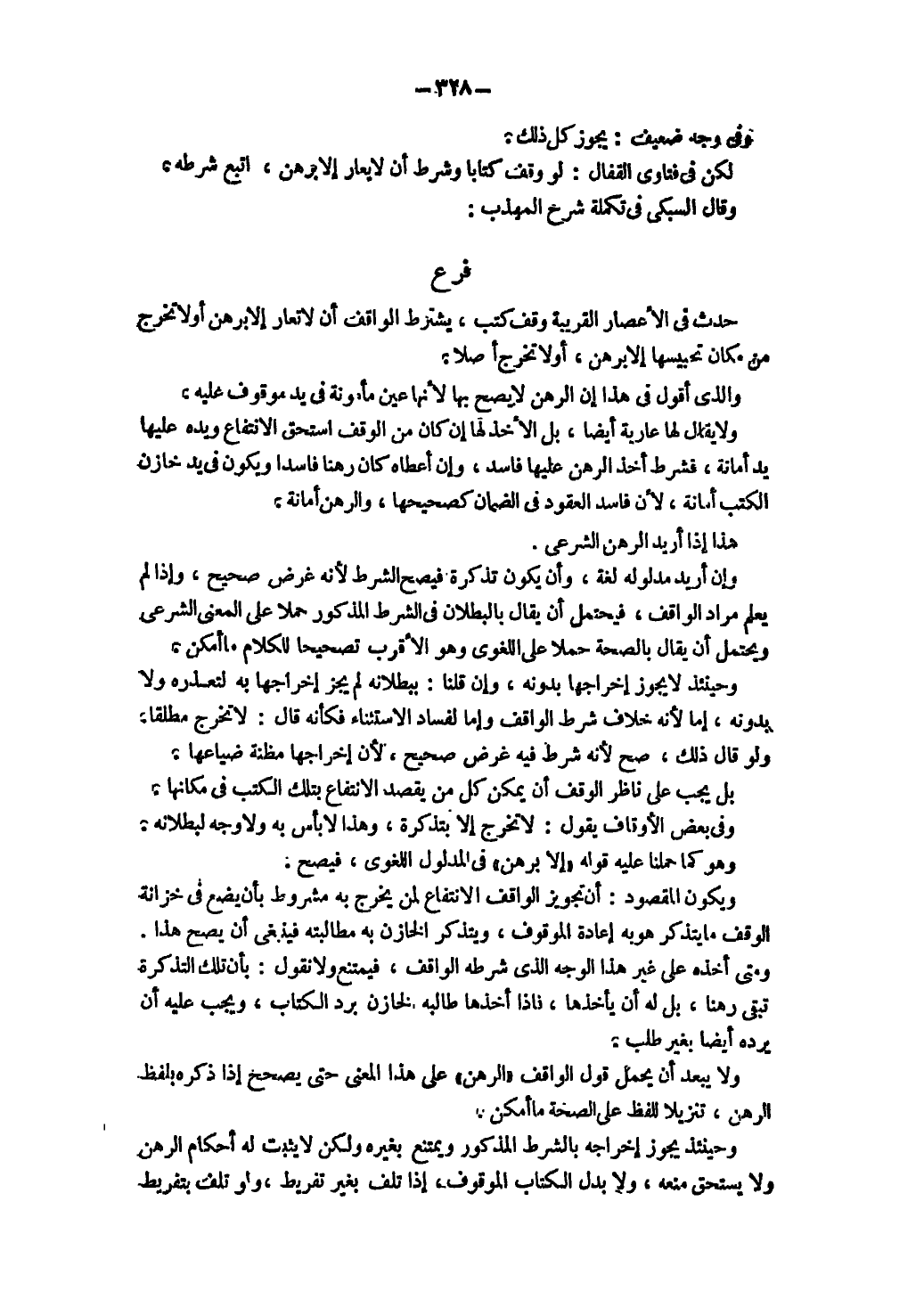 وَفِي وَجْهٍ ضَعِيفٍ: يَجُوزُ كُلُّ ذَلِكَ، لَكِنْ فِي فَتَاوَى الْقَفَّالِ: لَوْ وَقَفَ كِتَابًا وَشَرَطَ أَنْ لَا يُعَارُ إلَّا بِرَهْنٍ اُتُّبِعَ شَرْطُهُ وَقَالَ السُّبْكِيُّ فِي تَكْمِلَةِ شَرْحِ الْمُهَذَّبِ: فَرْعٌ حَدَثَ فِي الْأَعْصَارِ الْقَرِيبَةِ وَقْفُ كُتُبٍ، يَشْتَرِطُ الْوَاقِفُ أَنْ لَا تُعَارَ إلَّا بِرَهْنٍ أَوْ لَا تَخْرُجُ مِنْ مَكَانِ تَحْبِيسِهَا إلَّا بِرَهْنٍ، أَوْ لَا تَخْرُجُ أَصْلًا.