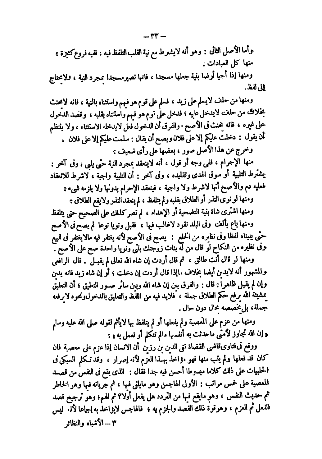 وَأَمَّا الْأَصْل الثَّانِي: وَهُوَ أَنَّهُ لَا يُشْتَرَط مَعَ نِيَّة الْقَلْب التَّلَفُّظ فِيهِ، فَفِيهِ فُرُوع كَثِيرَة مِنْهَا كُلّ الْعِبَادَات.