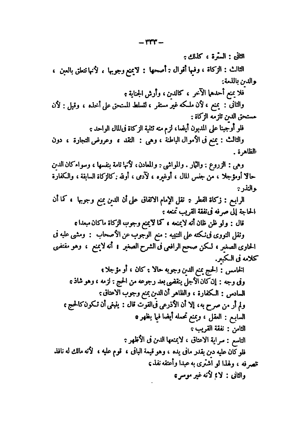 الْخَامِسُ: الْحَجُّ يَمْنَعُ الدَّيْنُ وُجُوبَهُ حَالًّا. كَانَ، أَوْ مُؤَجَّلًا. وَفِي وَجْهٍ: إنْ كَانَ الْأَجَلُ يَنْقَضِي بَعْدَ رُجُوعِهِ مِنْ الْحَجِّ. لَزِمَهُ، وَهُوَ شَاذٌّ. السَّادِسُ: الْكَفَّارَةُ، وَالظَّاهِرُ أَنَّ الدَّيْنَ يَمْنَعُ وُجُوبَ الْإِعْتَاقِ. وَلَمْ أَرَ مَنْ صَرَّحَ بِهِ، إلَّا أَنَّ الْأَذْرَعِيَّ فِي الْقُوتِ قَالَ: يَنْبَغِي أَنْ تَكُونَ كَالْحَجِّ. السَّابِعُ: الْعَقْلُ، وَيَمْنَعُ تَحَمُّلَهُ أَيْضًا فِيمَا يَظْهَرُ. الثَّامِنُ: نَفَقَةُ الْقَرِيبِ.