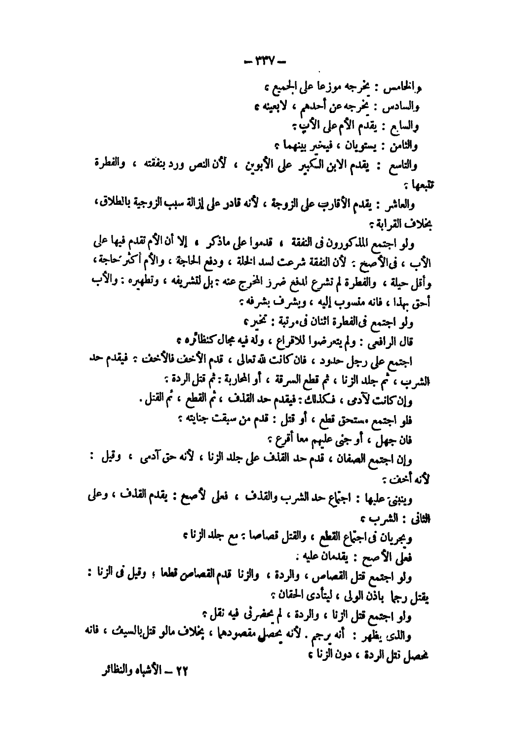 وَقَالَ الرَّافِعِيُّ: وَلَمْ يَتَعَرَّضُوا لِلْإِقْرَاعِ، وَلَهُ فِيهِ مَجَالٌ كَنَظَائِرِهِ اجْتَمَعَ عَلَى رَجُلٍ حُدُودٌ، فَإِنْ كَانَتْ لِلَّهِ تَعَالَى، قُدِّمَ الْأَخَفُّ فَالْأَخَفُّ، فَيُقَدَّمُ حَدُّ الشُّرْبِ، ثُمَّ جَلْدُ الزِّنَا، ثُمَّ قَطْعُ السَّرِقَةِ، أَوْ الْمُحَارَبَةِ، ثُمَّ قَتْلُ الرِّدَّةِ وَإِنْ كَانَتْ لِآدَمِيٍّ فَكَذَلِكَ: فَيُقَدَّمُ حَدُّ الْقَذْفِ ثُمَّ الْقَطْعُ ثُمَّ الْقَتْلُ، فَلَوْ اجْتَمَعَ مُسْتَحِقَّا قَطْعٍ، أَوْ قَتْلٍ: قُدِّمَ مَنْ سَبَقَتْ جِنَايَتُهُ، فَإِنْ جُهِلَ، أَوْ جُنِيَ عَلَيْهِمْ مَعًا أُقْرِعَ. وَإِنْ اجْتَمَعَ الصِّنْفَانِ، قُدِّمَ حَدُّ الْقَذْفِ عَلَى جَلْدِ الزِّنَا ; لِأَنَّهُ حَقُّ آدَمِيٍّ، وَقِيلَ: لِأَنَّهُ أَخَفُّ. وَيَنْبَنِي عَلَيْهَا: اجْتِمَاعُ حَدِّ الشُّرْبِ وَالْقَذْفِ، فَعَلَى الْأَصَحِّ: يُقَامُ الْقَذْفُ، وَعَلَى الثَّانِي: الشُّرْبُ. وَيَجْرِيَانِ فِي اجْتِمَاعِ الْقَطْعِ، وَالْقَتْلِ قِصَاصًا مَعَ جَلْدِ الزِّنَا.