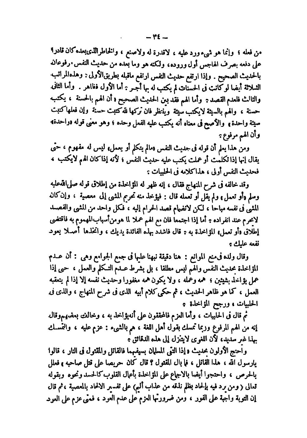 وَقَالَ وَلَده فِي مَنْعِ الْمَوَانِعِ: هُنَا دَقِيقَة نَبَّهْنَا عَلَيْهَا فِي جَمْعِ الْجَوَامِعِ وَهِيَ: أَنَّ عَدَم الْمُؤَاخَذَة بِحَدِيثِ النَّفْس وَالْهَمّ لَيْسَ مُطْلَقًا بَلْ بِشَرْطِ عَدَم التَّكَلُّم وَالْعَمَل، وَحَتَّى إذَا عَمِلَ يُؤَاخَذُ بِشَيْئَيْنِ هَمّه وَعَمَله، وَلَا يَكُون هَمُّهُ مَغْفُورًا، وَحَدِيث نَفْسه إلَّا إذَا لَمْ يَتَعَقَّبهُ الْعَمَل، كَمَا هُوَ ظَاهِر الْحَدِيث، ثُمَّ حَكَى كَلَامَ أَبِيهِ الَّذِي فِي شَرْحِ الْمِنْهَاجِ، وَاَلَّذِي فِي الْحَلَبِيَّاتِ وَرَجَّحَ الْمُؤَاخَذَة، ثُمَّ قَالَ فِي الْحَلَبِيَّاتِ: وَأَمَّا الْعَزْم فَالْمُحَقِّقُونَ عَلَى أَنَّهُ يُؤَاخَذُ بِهِ، وَخَالَفَ بَعْضهمْ وَقَالَ: إنَّهُ مِنْ الْهَمّ الْمَرْفُوع، وَرُبَّمَا تَمَسّك بِقَوْلِ أَهْل اللُّغَة، هَمَّ بِالشَّيْءِ عَزَمَ عَلَيْهِ، وَالتَّمَسُّكُ بِهَذَا غَيْر سَدِيد لِأَنَّ اللُّغَوِيّ لَا يَتَنَزَّل إلَى هَذِهِ الدَّقَائِق.