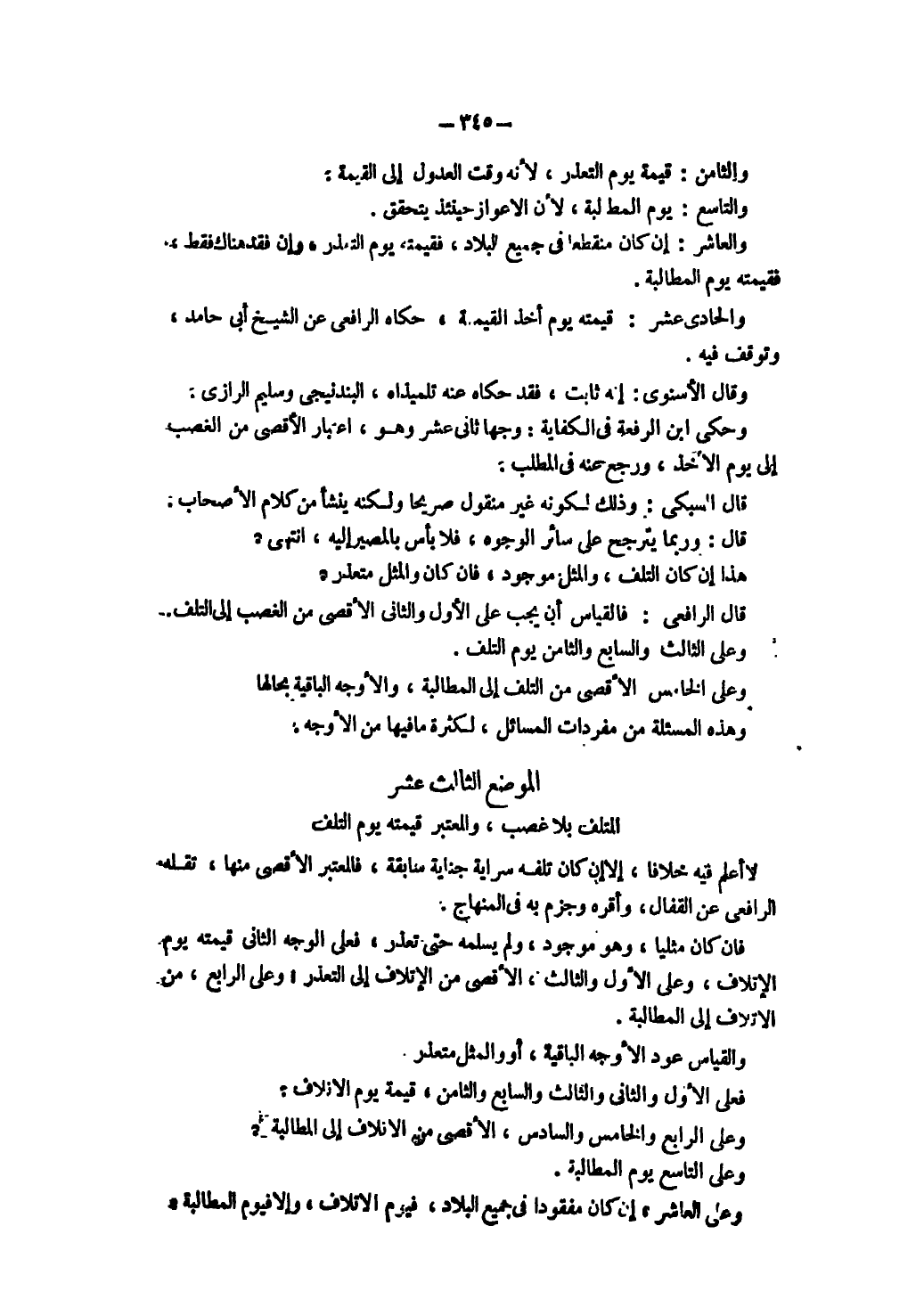 ثَانِيَ عَشَرَ وَهُوَ، اعْتِبَارُ الْأَقْصَى مِنْ الْغَصْبِ إلَى يَوْمِ الْأَخْذِ، وَرَجَعَ عَنْهُ فِي الْمَطْلَبِ. قَالَ السُّبْكِيُّ: وَذَلِكَ لِكَوْنِهِ غَيْرَ مَنْقُولٍ صَرِيحًا وَلَكِنَّهُ يَنْشَأُ مِنْ كَلَامِ الْأَصْحَابِ: قَالَ: وَرُبَّمَا يَتَرَجَّحُ عَلَى سَائِرِ الْوُجُوهِ، فَلَا بَأْسَ بِالْمَصِيرِ إلَيْهِ، انْتَهَى هَذَا إنْ كَانَ التَّلَفُ، وَالْمِثْلُ مَوْجُودٌ، فَإِنْ كَانَ وَالْمِثْلُ مُتَعَذِّرٌ.