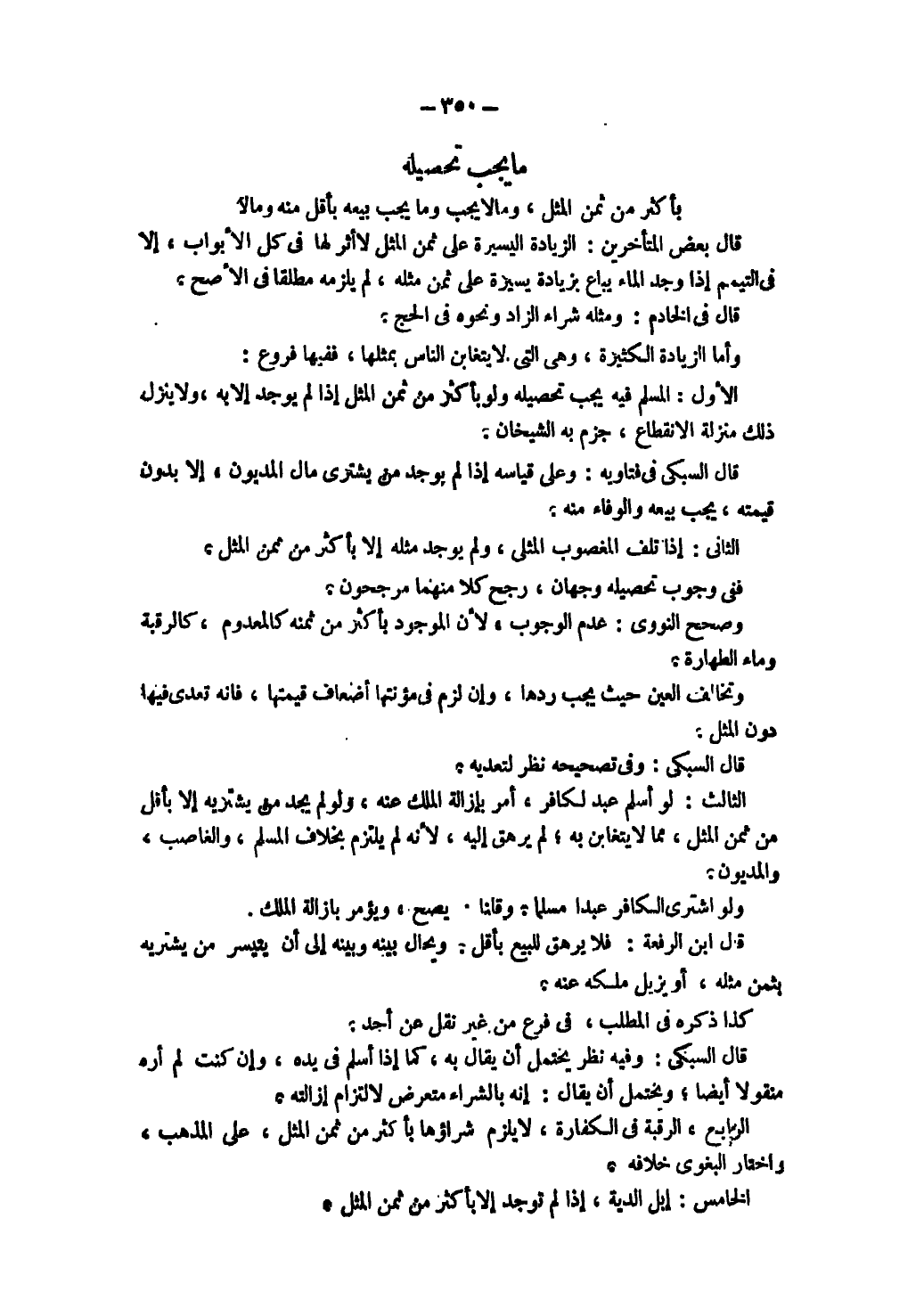 قَالَ السُّبْكِيُّ: وَفِيهِ نَظَرٌ يُحْتَمَلُ أَنْ يُقَالَ بِهِ، كَمَا إذَا أَسْلَمَ فِي يَدِهِ، وَإِنْ كُنْت لَمْ أَرَهُ مَنْقُولًا أَيْضًا ; وَيُحْتَمَلُ أَنْ يُقَالَ: إنَّهُ بِالشِّرَاءِ مُتَعَرِّضٌ لِالْتِزَامِ إزَالَتِهِ. الرَّابِعُ، الرَّقَبَةُ فِي الْكَفَّارَةِ، لَا يَلْزَمُ شِرَاؤُهَا بِأَكْثَرَ مِنْ ثَمَنِ الْمِثْلِ، عَلَى الْمَذْهَبِ، وَاخْتَارَ الْبَغَوِيّ خِلَافَهُ.