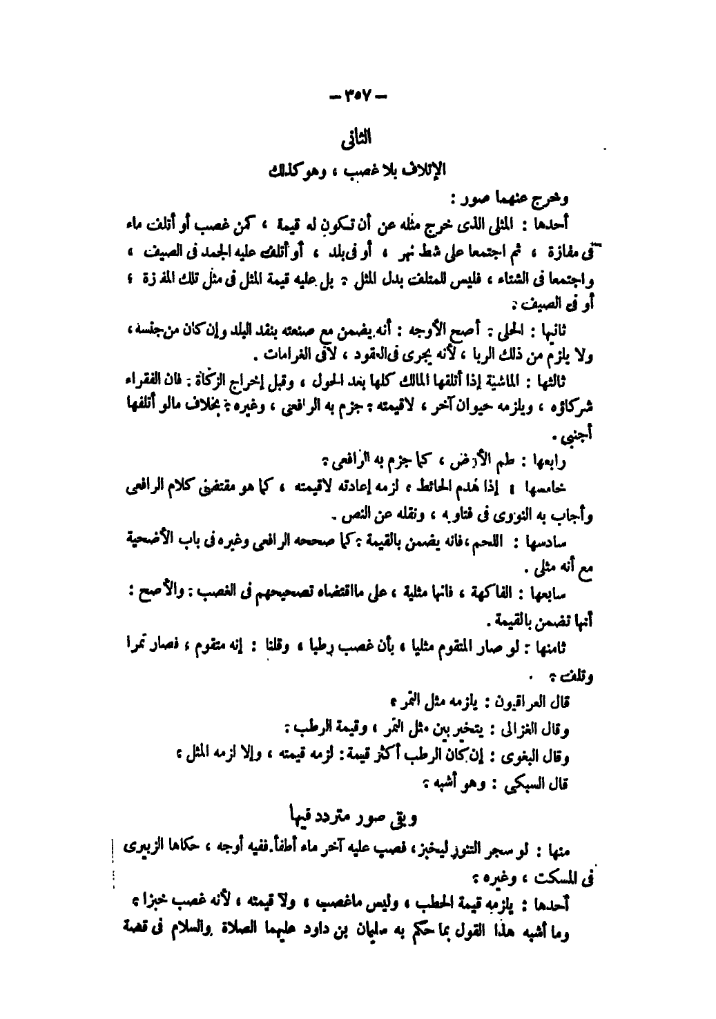 ثَامِنُهَا - لَوْ صَارَ الْمُتَقَوِّمُ مِثْلِيًّا بِأَنْ غَصَبَ رُطَبًا، وَقُلْنَا: إنَّهُ مُتَقَوِّمٌ، فَصَارَ تَمْرًا وَتَلِفَ. قَالَ الْعِرَاقِيُّونَ: يَلْزَمُهُ مِثْلُ التَّمْرِ وَقَالَ الْغَزَالِيُّ: يُتَخَيَّرُ بَيْنَ مِثْلِ التَّمْرِ، وَقِيمَةِ الرُّطَبِ وَقَالَ الْبَغَوِيّ: إنْ كَانَ الرُّطَبُ أَكْثَرَ قِيمَةٍ: لَزِمَهُ قِيمَتُهُ، وَإِلَّا لَزِمَهُ الْمِثْلُ قَالَ السُّبْكِيُّ: وَهُوَ أَشْبَهُ وَبَقِيَ صُوَرٌ مُتَرَدَّدٌ فِيهَا مِنْهَا: لَوْ سَجَرَ التَّنُّورَ لِيَخْبِزَ فَصَبَّ عَلَيْهِ آخَرُ مَاءً أَطْفَأَهُ فَفِيهِ أَوْجُهٌ، حَكَاهَا الزُّبَيْرِيُّ فِي الْمُسْكِتِ، وَغَيْرِهِ أَحَدُهَا - يَلْزَمُهُ قِيمَةُ الْحَطَبِ وَلَيْسَ مَا غَصَبَ وَلَا قِيمَتُهُ ; لِأَنَّهُ غَصَبَ خُبْزًا وَمَا أَشْبَهَ هَذَا الْقَوْلِ بِمَا حَكَمَ بِهِ سُلَيْمَانُ بْنُ دَاوُد عَلَيْهِمَا الصَّلَاةُ وَالسَّلَامُ فِي قِصَّةِ