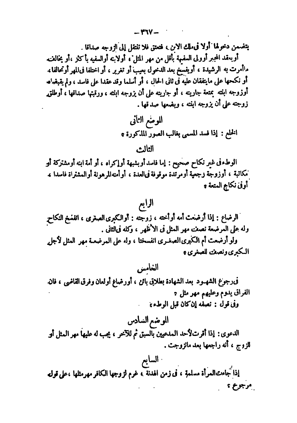 أَوْ بِعَقْدِ الْمُجْبَرِ أَوْ وَلِيِّ السَّفِيهَةِ بِأَقَلَّ مِنْ مَهْرِ الْمِثْلِ، أَوْ لِابْنِهِ أَوْ السَّفِيهِ بِأَكْثَرَ، أَوْ يُخَالِفُ مَا أَمَرَتْ بِهِ الرَّشِيدَةُ، أَوْ يُفْسَخُ بَعْدَ الدُّخُولِ بِعَيْبٍ أَوْ تَغْرِيرٍ، أَوْ اخْتَلَفَا فِي الْمَهْرِ أَوْ تَحَالَفَا، أَوْ نَكَحَهَا عَلَى مَا يَتَّفِقَانِ عَلَيْهِ فِي ثَانِي الْحَالِ، أَوْ أَسْلَمَا وَقَدْ عَقَدَا عَلَى فَاسِدٍ، وَلَمْ يُقْبِضَاهُ، أَوْ زَوَّجَهُ ابْنَتَهُ بِمُتْعَةِ جَارِيَتِهِ أَوْ جَارِيَتَهُ عَلَى أَنْ يُزَوِّجَهُ ابْنَتَهُ، وَرَقَبَتُهَا صَدَاقهَا، أَوْ طَلَّقَ زَوْجَتَهُ عَلَى أَنْ يُزَوِّجَهُ ابْنَتَهُ، وَبُضْعُهَا صَدَاقُهَا.