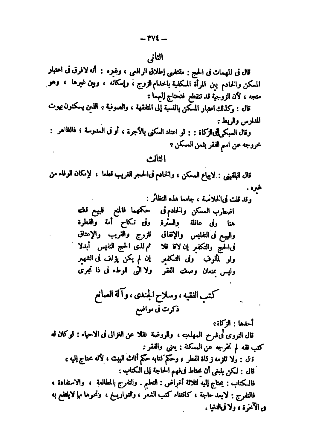 ِ ذُكِرَتْ فِي مَوَاضِعَ أَحَدُهَا: الزَّكَاةُ قَالَ النَّوَوِيُّ فِي شَرْحِ الْمُهَذَّبِ وَالرَّوْضَةِ نَقْلًا عَنْ الْغَزَالِيِّ فِي الْإِحْيَاءِ: لَوْ كَانَ لَهُ كُتُبُ فِقْهٍ لَمْ تُخْرِجْهُ عَنْ الْمَسْكَنَةِ: يَعْنِي وَالْفَقْرِ. قَالَ: وَلَا تَلْزَمُهُ زَكَاةُ الْفِطْرِ، وَحُكْمُ كِتَابِهِ حُكْمُ أَثَاثِ الْبَيْتِ ; لِأَنَّهُ مُحْتَاجٌ إلَيْهِ قَالَ: لَكِنْ يَنْبَغِي أَنْ يَحْتَاطَ فِي فَهْمِ الْحَاجَةِ إلَى الْكِتَابِ فَالْكِتَابُ يُحْتَاجُ إلَيْهِ لِثَلَاثَةِ أَغْرَاضٍ: التَّعْلِيمُ، وَالتَّفَرُّجُ بِالْمُطَالَعَةِ، وَالِاسْتِفَادَةُ.