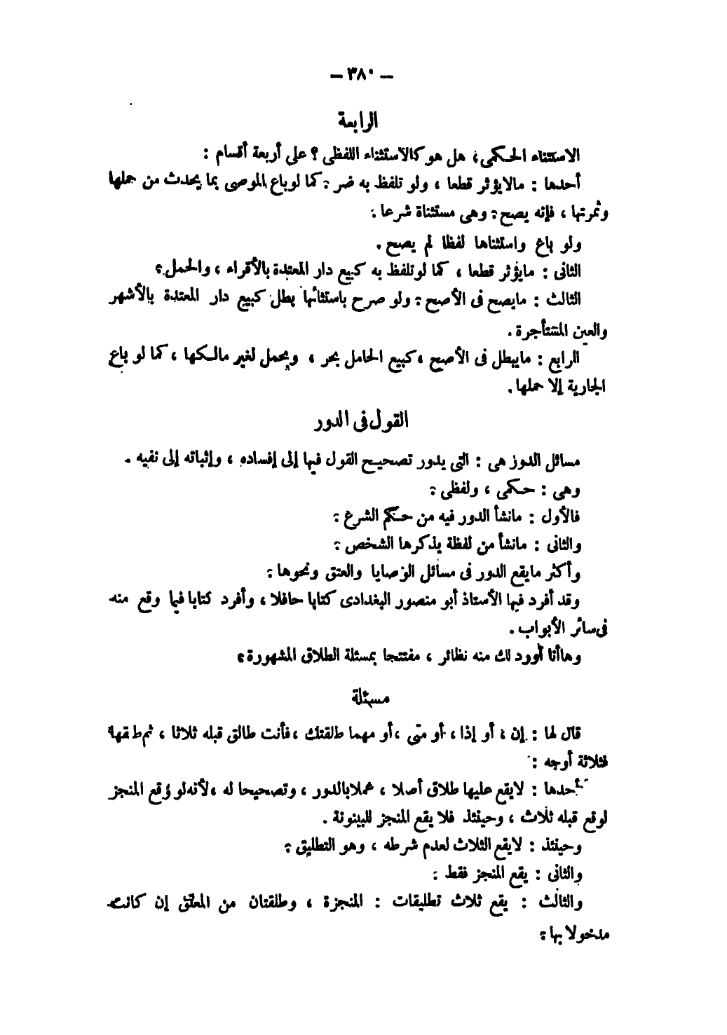 الرَّابِعَةُ: الِاسْتِثْنَاءُ الْحُكْمِيِّ، هَلْ هُوَ كَالِاسْتِثْنَاءِ اللَّفْظِيِّ؟ عَلَى أَرْبَعَةِ أَقْسَامٍ: أَحَدُهَا: مَا لَا يُؤَثِّرُ قَطْعًا، وَلَوْ تَلَفَّظَ بِهِ ضُرَّ. كَمَا لَوْ بَاعَ الْمُوصَى بِمَا يَحْدُثُ مِنْ حَمْلِهَا وَثَمَرَتِهَا، فَإِنَّهُ يَصِحُّ وَهِيَ مُسْتَثْنَاةٌ شَرْعًا وَلَوْ بَاعَ وَاسْتَثْنَاهَا لَفْظًا لَمْ يَصِحَّ الثَّانِي: مَا يُؤَثِّرُ قَطْعًا، كَمَا لَوْ تَلَفَّظَ بِهِ كَبَيْعِ دَارِ الْمُعْتَدَّةِ بِالْأَقْرَاءِ، وَالْحَمْلِ.