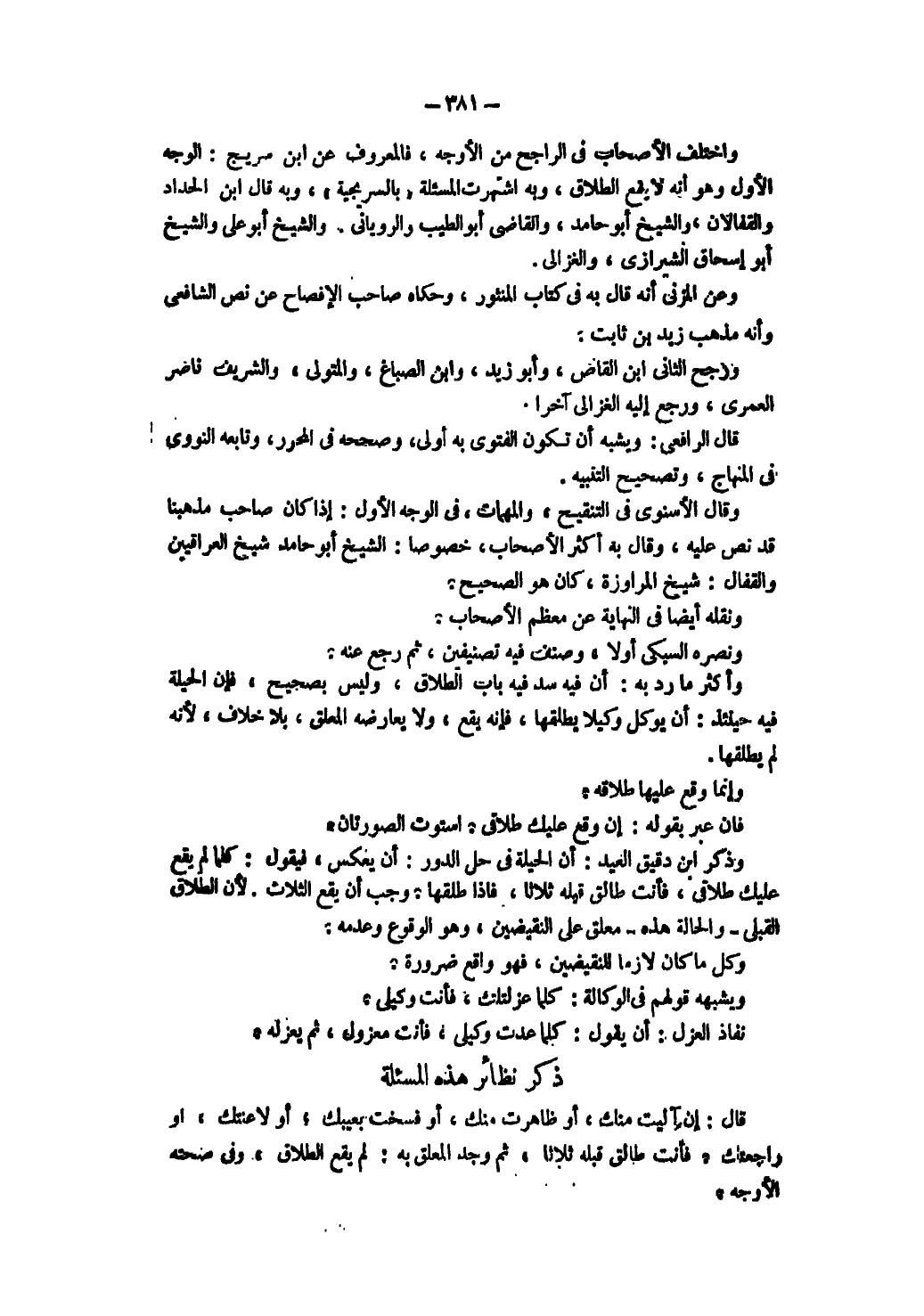 وَقَالَ الْإِسْنَوِيُّ فِي التَّنْقِيحِ، وَالْمُهِمَّاتِ فِي الْوَجْهِ الْأَوَّلِ: إذَا كَانَ صَاحِبُ مَذْهَبِنَا قَدْ نَصَّ عَلَيْهِ، وَقَالَ بِهِ أَكْثَرُ الْأَصْحَابِ، خُصُوصًا: الشَّيْخُ أَبُو حَامِدٍ شَيْخُ الْعِرَاقِيِّينَ وَالْقَفَّالُ: شَيْخُ الْمَرَاوِزَةِ، كَانَ هُوَ الصَّحِيحُ وَنَقَلَهُ أَيْضًا فِي النِّهَايَةِ عَنْ مُعْظَمِ الْأَصْحَابِ وَنَصَرَهُ السُّبْكِيُّ أَوَّلًا، وَصَنَّفَ فِيهِ تَصْنِيفَيْنِ، ثُمَّ رَجَعَ عَنْهُ وَأَكْثَرُ مَا رُدَّ بِهِ: أَنَّ فِيهِ بَابَ الطَّلَاقِ، وَلَيْسَ بِصَحِيحٍ، فَإِنَّ الْحِيلَةَ فِيهِ حِينَئِذٍ: أَنْ يُوَكِّلَ وَكِيلًا يُطَلِّقُهَا، فَإِنَّهُ يَقَعُ، وَلَا يُعَارِضُهُ الْمُعَلِّقُ، بِلَا خِلَافٍ ; لِأَنَّهُ لَمْ يُطَلِّقْهَا وَإِنَّمَا وَقَعَ عَلَيْهَا طَلَاقُهُ، فَإِنْ عَبَّرَ بِقَوْلِهِ: إنْ وَقَعَ عَلَيْكِ طَلَاقِي، اسْتَوَتْ الصُّورَتَانِ، وَذَكَرَ ابْنُ دَقِيقِ الْعِيدِ: أَنَّ الْحِيلَةَ فِي حَلِّ الدَّوْرِ: أَنْ يَعْكِسَ، فَيَقُولَ: كُلَّمَا لَمْ يَقَعْ عَلَيْكِ طَلَاقِي، فَأَنْتِ طَالِقٌ قَبْلَهُ ثَلَاثًا، فَإِذَا طَلَّقَهَا وَجَبَ أَنْ يَقَعَ الثَّلَاثُ ; لِأَنَّ الطَّلَاقَ الْقَبْلِيِّ - وَالْحَالَةُ هَذِهِ - مُعَلَّقٌ عَلَى النَّقِيضَيْنِ، وَهُوَ الْوُقُوعُ وَعَدَمُهُ وَكُلُّ مَا كَانَ لَازِمًا لِلنَّقِيضَيْنِ، فَهُوَ وَاقِعٌ ضَرُورَةً. وَيُشْبِهُهُ قَوْلُهُمْ فِي الْوِكَالَةِ: كُلَّمَا عَزَلْتُك، فَأَنْتَ وَكِيلِي. نَفَاذُ الْعَزْلِ: أَنْ يَقُولَ: كُلَّمَا عُدْت وَكِيلِي، فَأَنْتَ مَعْزُولٌ، ثَمَّ يَعْزِلُهُ. ذِكْرُ نَظَائِرِ هَذِهِ الْمَسْأَلَةِ: قَالَ: إنْ آلَيْتُ مِنْكِ، أَوْ ظَاهَرْت مِنْكِ، أَوْ فَسَخْت بِعَيْبِكِ ; أَوْ لَاعَنْتُكِ، أَوْ رَاجَعْتُكِ فَأَنْتِ طَالِقٌ قَبْلَهُ ثَلَاثًا، ثُمَّ وُجِدَ الْمُعَلَّقُ بِهِ: لَمْ يَقَعْ الطَّلَاقُ وَفِي صِحَّتِهِ الْأَوْجُهُ.