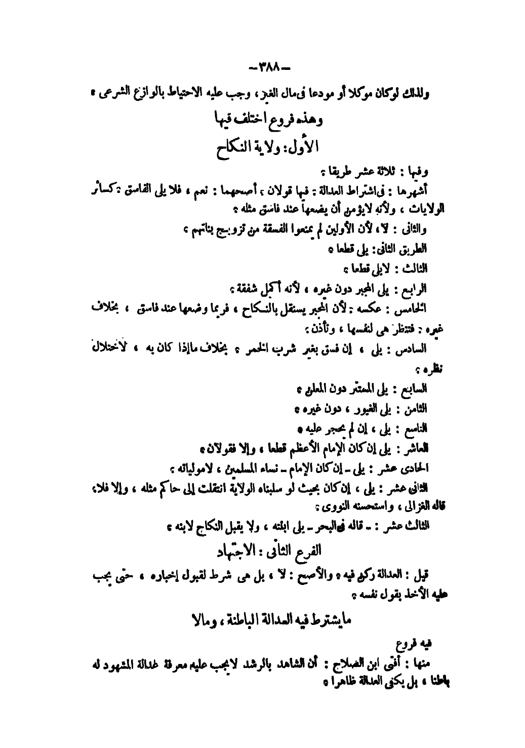 الْأَوَّلُ: وِلَايَةُ النِّكَاحِ وَفِيهَا: ثَلَاثَةَ عَشَرَ طَرِيقًا أَشْهَرُهَا: فِي اشْتِرَاطِ الْعَدَالَةِ. فِيهَا قَوْلَانِ، أَصَحُّهُمَا: نَعَمْ، فَلَا يَلِي الْفَاسِقُ كَسَائِرِ الْوِلَايَاتِ ; وَلِأَنَّهُ لَا يُؤْمَنُ أَنْ يَضَعَهَا عِنْدَ فَاسِقٍ مِثْلِهِ.