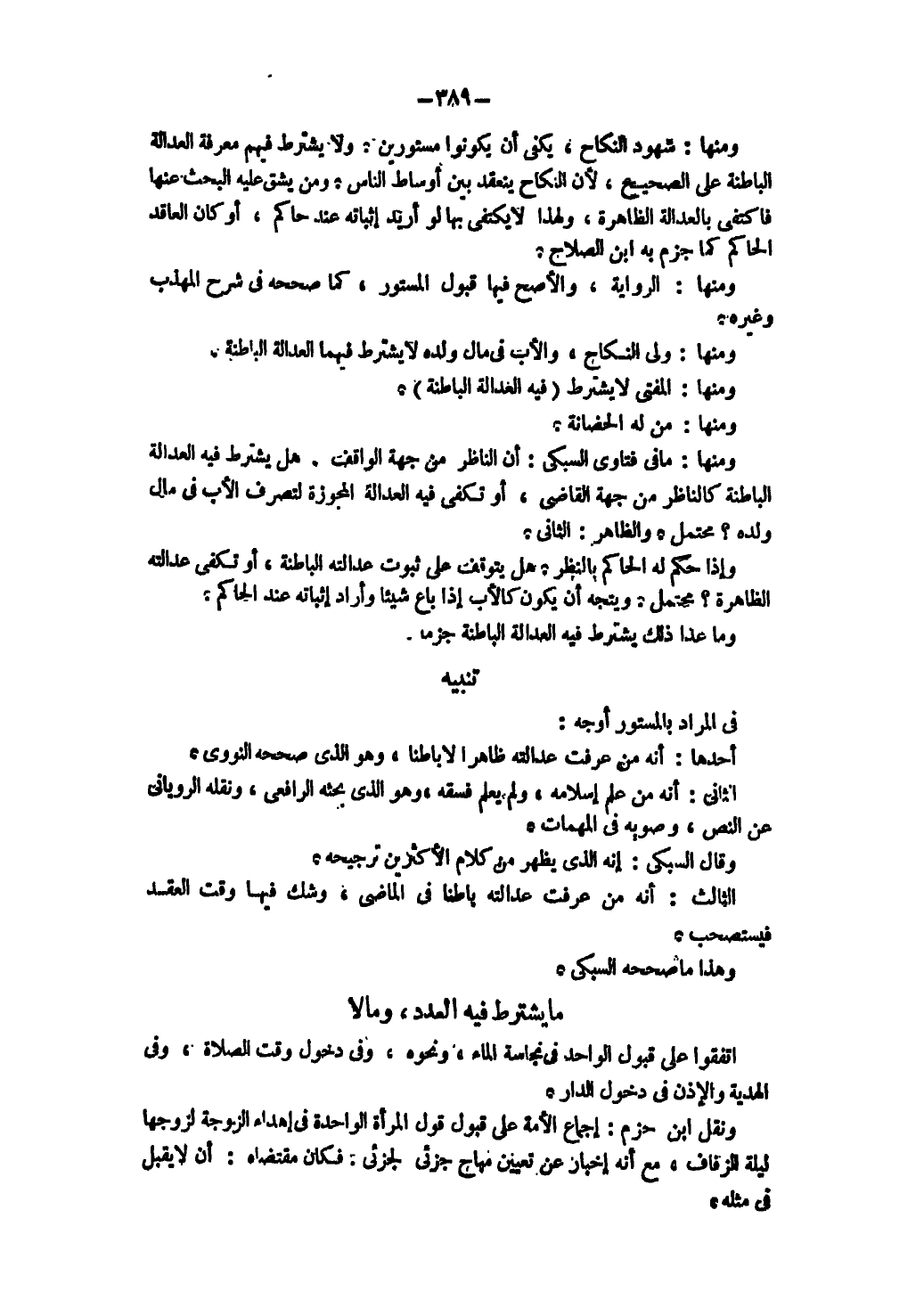 وَمِنْهَا: شُهُودُ النِّكَاحِ يَكْفِي أَنْ يَكُونُوا مَسْتُورِينَ وَلَا يُشْتَرَطُ فِيهِمْ مَعْرِفَةُ الْعَدَالَةِ الْبَاطِنَةِ عَلَى الصَّحِيحِ ; لِأَنَّ النِّكَاحَ يَنْعَقِدُ بَيْنَ أَوْسَاطِ النَّاسِ، وَمَنْ يُشَقُّ عَلَيْهِ الْبَحْثُ عَنْهَا فَاكْتُفِيَ بِالْعَدَالَةِ الظَّاهِرَةِ، وَلِهَذَا لَا يُكْتَفَى بِهَا لَوْ أُرِيدَ إثْبَاتُهُ عِنْدَ حَاكِمٍ، أَوْ كَانَ الْعَاقِدُ الْحَاكِمُ كَمَا جَزَمَ بِهِ ابْنُ الصَّلَاحِ وَمِنْهَا: الرِّوَايَةُ، الْأَصَحُّ فِيهَا قَبُولُ الْمَسْتُورِ كَمَا صَحَّحَهُ فِي شَرْحِ الْمُهَذَّبِ وَغَيْرِهِ.