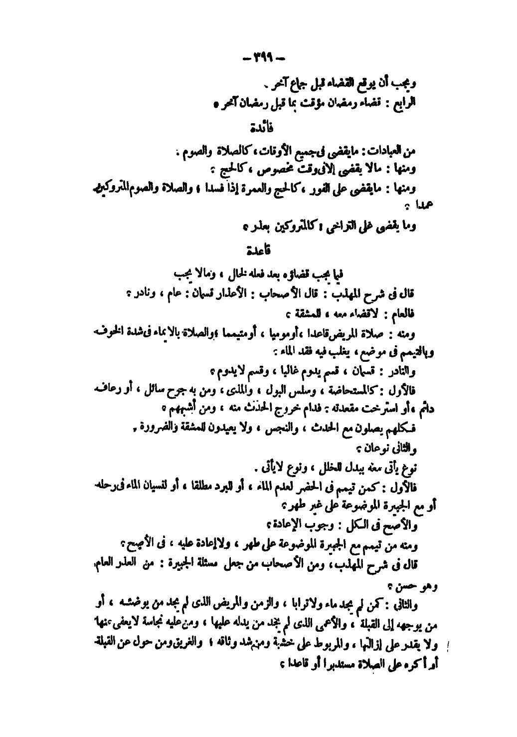 ُ. قَالَ فِي شَرْحِ الْمُهَذَّبِ: قَالَ الْأَصْحَابُ: الْأَعْذَارُ قِسْمَانِ: عَامٌّ، وَنَادِرٌ، فَالْعَامُّ: لَا قَضَاءَ مَعَهُ لِلْمَشَقَّةِ، وَمِنْهُ: صَلَاةُ الْمَرِيضِ قَاعِدًا، أَوْ مُومِيًا، أَوْ مُتَيَمِّمًا ; وَالصَّلَاةُ بِالْإِيمَاءِ فِي شِدَّةِ الْخَوْفِ، وَبِالتَّيَمُّمِ فِي مَوْضِعٍ، يَغْلِبُ فِيهِ فَقْدُ الْمَاءِ. وَالنَّادِرُ: قِسْمَانِ: قِسْمٌ يَدُومُ غَالِبًا، وَقِسْمٌ لَا يَدُومُ.