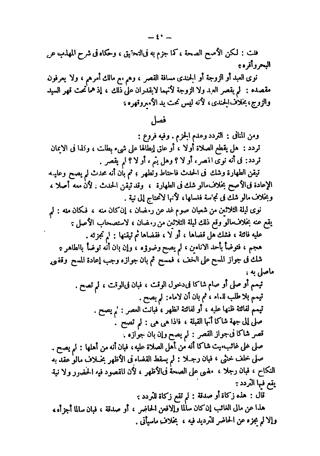 وَمِنْ الْمُنَافِي: التَّرَدُّدُ وَعَدَمُ الْجَزْم. وَفِيهِ فُرُوعٌ: تَرَدَّدَ: هَلْ يَقْطَعُ الصَّلَاةَ أَوْ لَا، أَوْ عَلَّقَ إبْطَالَهَا عَلَى شَيْءٍ بَطَلَتْ، وَكَذَا فِي الْإِيمَانِ. تَرَدَّدَ: فِي أَنَّهُ نَوَى الْقَصْرَ أَوْ لَا؟ وَهَلْ يُتِمُّ، أَوْ لَا؟ لَمْ يَقْصُرْ.