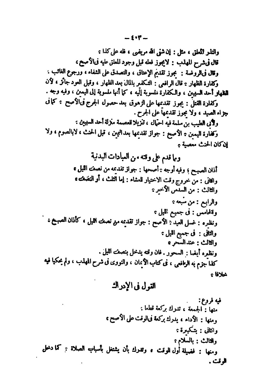وَكَفَّارَةُ الْيَمِينِ الْأَصَحُّ جَوَازُ تَقْدِيمِهَا بَعْدَ الْيَمِينِ قَبْلَ الْحِنْثِ، لَا بِالصَّوْمِ، وَلَا إنْ كَانَ الْحِنْثُ مَعْصِيَةً وَمِمَّا قُدِّمَ عَلَى وَقْتِهِ مِنْ الْعِبَادَاتِ الْبَدَنِيَّةِ: أَذَانُ الصُّبْحِ: وَفِيهِ أَوْجُهٌ: أَصَحُّهَا: جَوَازُ تَقْدِيمِهِ مِنْ نِصْفِ اللَّيْلِ