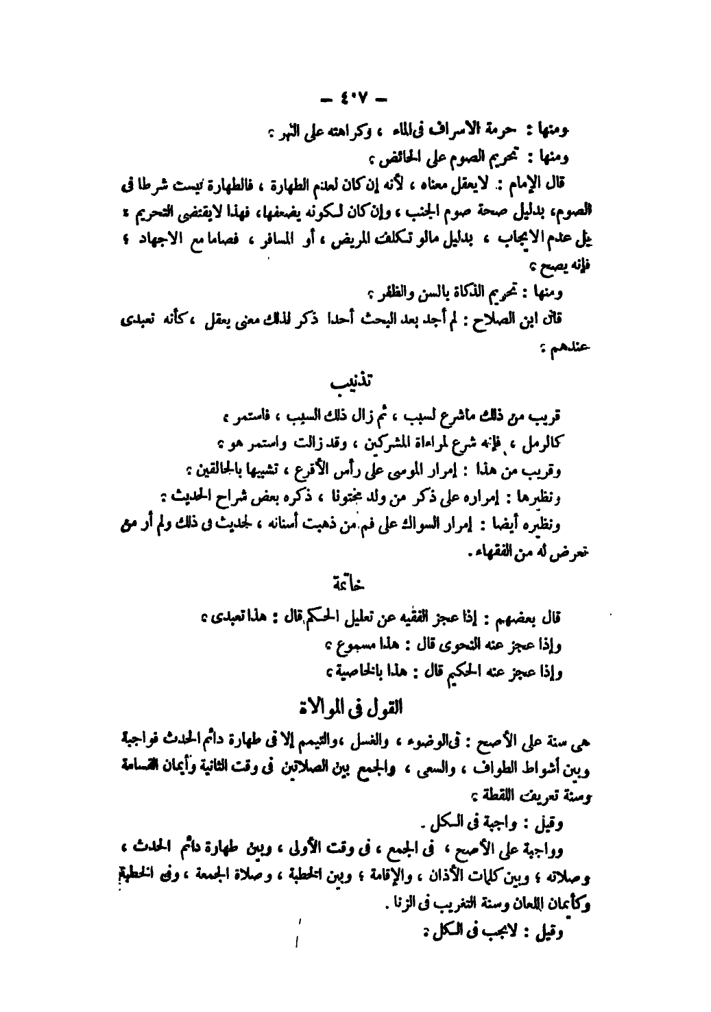 وَمِنْهَا: حُرْمَةُ الْإِسْرَافِ فِي الْمَاءِ وَكَرَاهَتُهُ عَلَى النَّهْرِ. وَمِنْهَا: تَحْرِيمُ الصَّوْمِ عَلَى الْحَائِضِ. قَالَ الْإِمَامُ: لَا يُعْقَلُ مَعْنَاهُ ; لِأَنَّهُ إنْ كَانَ لِعَدَمِ الطَّهَارَةِ فَالطَّهَارَةُ لَيْسَتْ شَرْطًا فِي الصَّوْمِ بِدَلِيلِ صِحَّةِ صَوْمِ الْجُنُبِ، وَإِنْ كَانَ لِكَوْنِهِ يُضْعِفُهَا، فَهَذَا لَا يَقْتَضِي التَّحْرِيمَ بَلْ عَدَمَ الْإِيجَابِ بِدَلِيلِ مَا لَوْ تَكَلَّفَ الْمَرِيضُ أَوْ الْمُسَافِرُ، فَصَامَا مَعَ الْإِجْهَادِ فَإِنَّهُ يَصِحُّ.