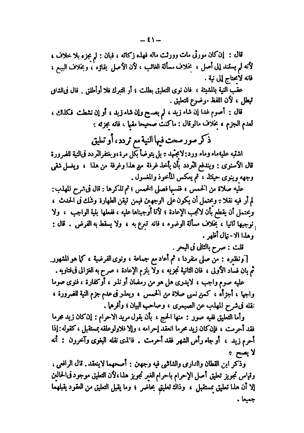 قَالَ: إنْ كَانَ مُوَرِّثِي مَاتَ وَوَرِثْت مَالَهُ فَهَذِهِ زَكَاتُهُ، فَبَانَ: لَمْ يُجْزِهِ بِلَا خِلَافٍ ; لِأَنَّهُ لَمْ يَسْتَنِدْ إلَى أَصْلٍ، بِخِلَافِ مَسْأَلَةِ الْغَائِبِ ; لِأَنَّ الْأَصْلَ بَقَاؤُهُ، وَبِخِلَافِ الْبَيْعِ، فَإِنَّهُ لَا يَحْتَاجُ إلَى نِيَّةٍ.