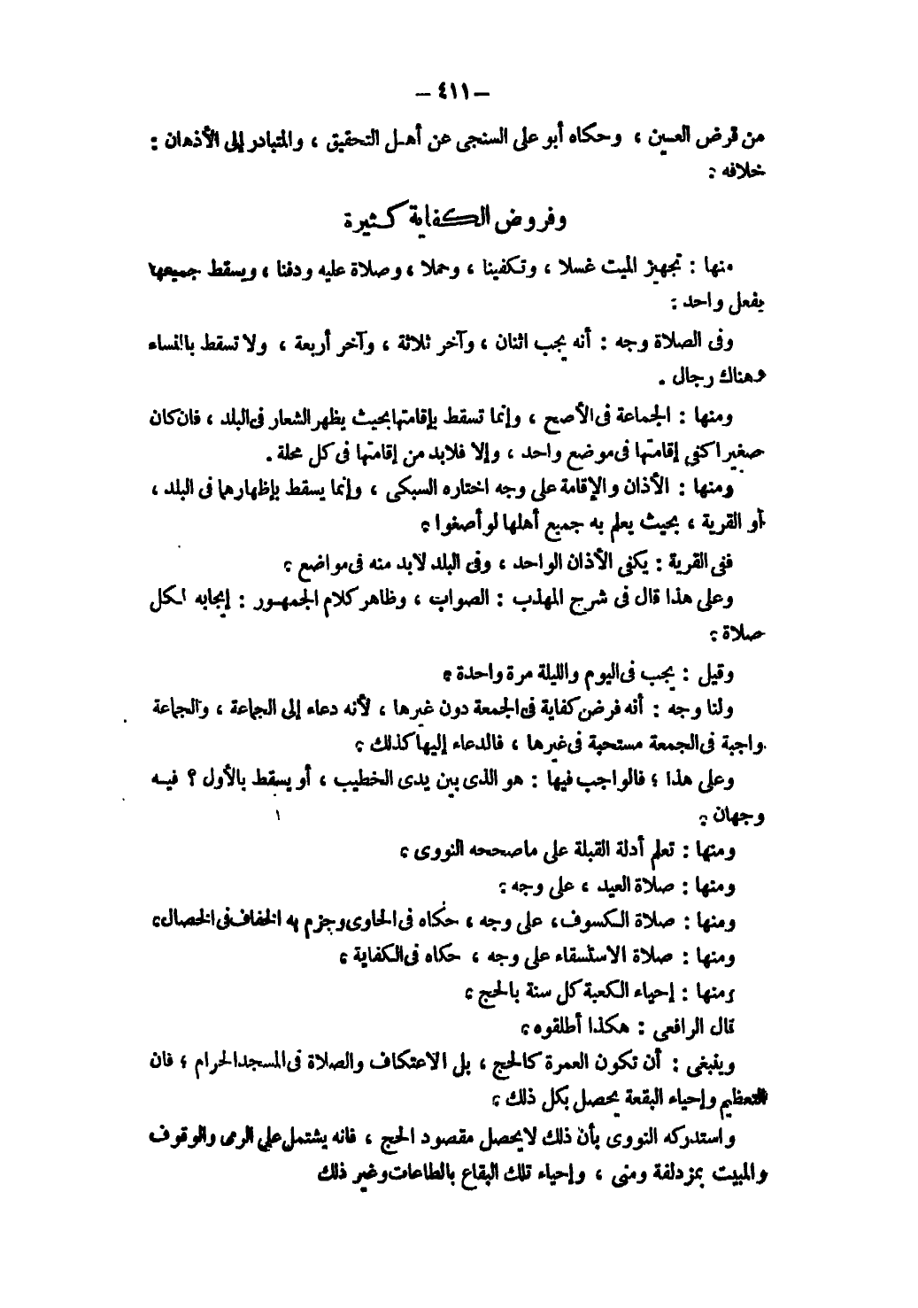 مِنْ فَرْضِ الْعَيْنِ، وَحَكَاهُ أَبُو عَلِيٍّ السِّنْجِيُّ عَنْ أَهْلِ التَّحْقِيقِ وَالْمُتَبَادَرُ إلَى الْأَذْهَانِ: خِلَافُهُ وَفُرُوضُ الْكِفَايَةِ كَثِيرَةٌ مِنْهَا: تَجْهِيزُ الْمَيِّتِ غُسْلًا وَتَكْفِينًا وَحَمْلًا وَصَلَاةً عَلَيْهِ وَدَفْنًا، وَيَسْقُطُ جَمِيعُهَا بِفِعْلِ وَاحِدٍ وَفِي الصَّلَاةِ وَجْهٌ: أَنَّهُ يَجِبُ اثْنَانِ وَآخَرُ: ثَلَاثَةٌ، وَآخَرُ: أَرْبَعَةٌ وَلَا تَسْقُطُ بِالنِّسَاءِ وَهُنَاكَ رِجَالٌ.