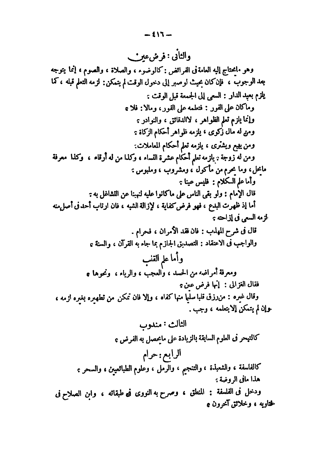 الرَّابِعُ: حَرَامٌ كَالْفَلْسَفَةِ، وَالشَّعْوَذَةِ، وَالتَّنْجِيمِ، وَالرَّمْلِ،، وَعُلُومِ الطَّبَائِعِيِّينَ، وَالسِّحْرِ، هَذَا مَا فِي الرَّوْضَةِ. وَدَخَلَ فِي الْفَلْسَفَةِ: الْمَنْطِقُ.