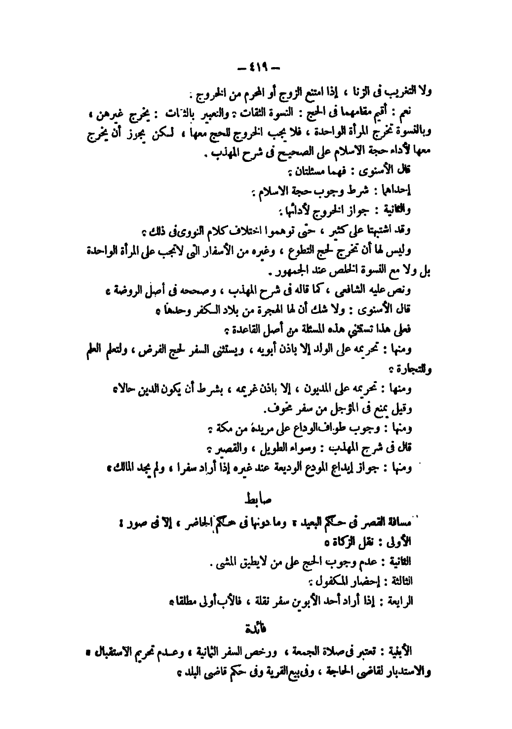وَالثَّانِيَةُ: جَوَازُ الْخُرُوجِ لِأَدَائِهَا. وَقَدْ اشْتَبَهَتَا عَلَى كَثِيرٍ حَتَّى تَوَهَّمُوا اخْتِلَافَ كَلَامِ النَّوَوِيِّ فِي ذَلِكَ. وَلَيْسَ لَهَا أَنَّ تَخْرُجَ لِحَجِّ التَّطَوُّعِ، وَغَيْرِهِ مِنْ الْأَسْفَارِ الَّتِي لَا تَجِبُ عَلَى الْمَرْأَةِ الْوَاحِدَةِ بَلْ وَلَا مَعَ النِّسْوَةِ الْخُلَّصِ عِنْد الْجُمْهُور.