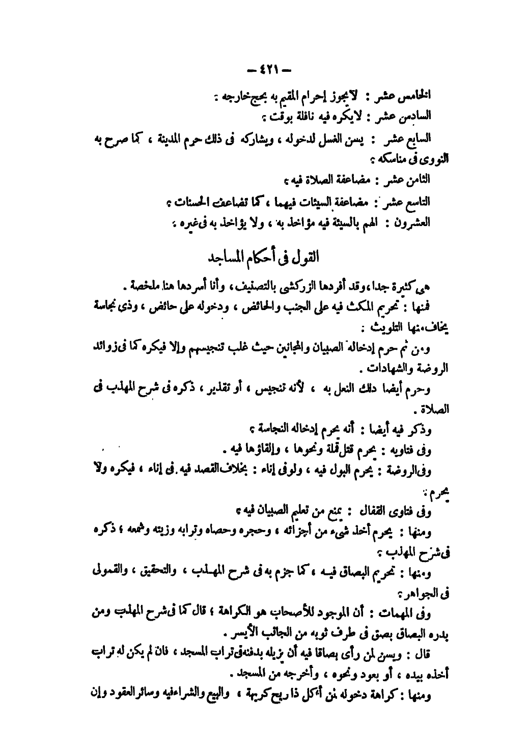 ذَكَرَهُ فِي شَرْحِ الْمُهَذَّبِ فِي الصَّلَاةِ. وَذَكَرَ فِيهِ أَيْضًا: أَنَّهُ يَحْرُمُ إدْخَالُهُ النَّجَاسَةَ. وَفِي فَتَاوِيهِ: يَحْرُمُ قَتْلُ قَمْلَةٍ وَنَحْوِهَا وَإِلْقَاؤُهَا فِيهِ. وَفِي الرَّوْضَةِ: يَحْرُمُ الْبَوْلُ فِيهِ وَلَوْ فِي إنَاءٍ: بِخِلَافِ الْقَصْدِ فِيهِ فِي إنَاءٍ، فَيُكْرَهُ وَلَا يَحْرُمُ. وَفِي فَتَاوَى الْقَفَّالُ: يُمْنَعُ مِنْ تَعْلِيمِ الصِّبْيَانِ فِيهِ. وَمِنْهَا: يَحْرُمُ أَخْذُ شَيْءٍ مِنْ أَجْزَائِهِ، وَحَجَرِهِ وَحَصَاهُ وَتُرَابِهِ وَزَيْتِهِ وَشَمْعِهِ، ذَكَرَهُ فِي شَرْحِ الْمُهَذَّبِ. وَمِنْهَا: تَحْرِيمُ الْبُصَاقِ فِيهِ كَمَا جَزَمَ بِهِ فِي شَرْحِ الْمُهَذَّبِ، وَالتَّحْقِيقِ، وَالْقَمُولِيِّ فِي الْجَوَاهِرِ.