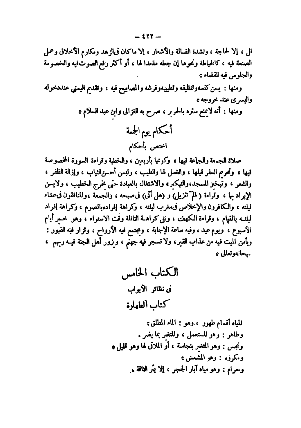 الْكِتَابُ الْخَامِسُ فِي نَظَائِرِ الْأَبْوَابِ كِتَابُ الطَّهَارَةِ الْمِيَاه أَقْسَامٌ: طَهُورٌ وَهُوَ الْمَاءُ الْمُطْلَقُ. وَطَاهِرٌ وَهُوَ الْمُسْتَعْمَلُ، وَالْمُتَغَيِّرُ بِمَا يَضُرُّ. وَنَجِسٌ: وَهُوَ الْمُتَغَيِّرُ بِنَجَاسَةٍ أَوْ الْمُلَاقِي لَهَا وَهُوَ قَلِيلٌ. وَمَكْرُوهٌ: وَهُوَ الْمُشَمَّسُ. وَحَرَامٌ: وَهُوَ مِيَاهُ آبَارِ الْحِجْرِ إلَّا بِئْرَ النَّاقَةِ
