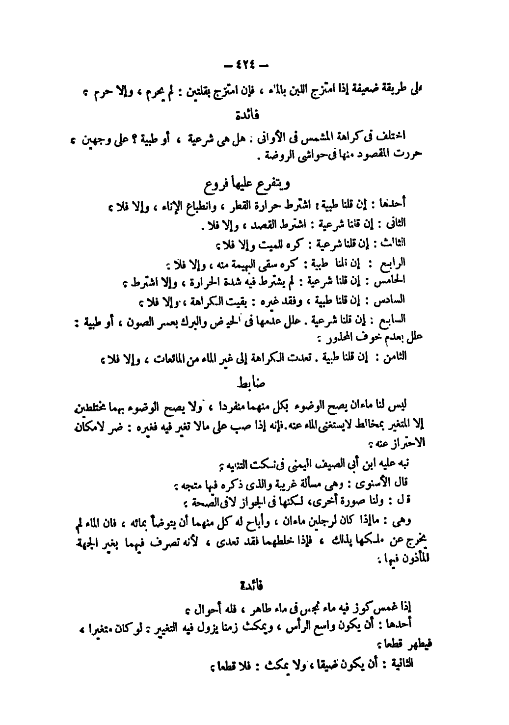 فَائِدَةٌ: اُخْتُلِفَ فِي كَرَاهَةِ الْمُشَمَّسِ فِي الْأَوَانِي: هَلْ هِيَ شَرْعِيَّةٌ أَوْ طِبِّيَّةٌ؟ عَلَى وَجْهَيْنِ. حَرَّرْت الْمَقْصُودَ مِنْهَا فِي حَوَاشِي الرَّوْضَةِ وَيَتَفَرَّعُ عَلَيْهَا فُرُوعٌ: