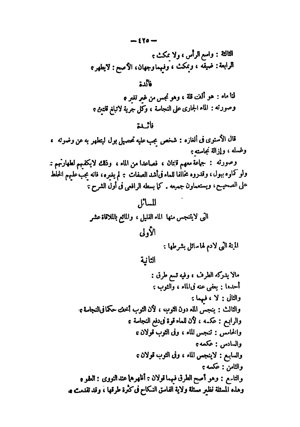 فَائِدَةٌ: قَالَ الْإِسْنَوِيُّ فِي أَلْغَازِهِ: شَخْصٌ يَجِبُ عَلَيْهِ تَحْصِيلُ بَوْلٍ لِيَتَطَهَّرَ بِهِ عَنْ وُضُوئِهِ وَغُسْلِهِ، وَإِزَالَةِ نَجَاسَتِهِ. وَصُورَتُهُ: جَمَاعَةٌ مَعَهُمْ قُلَّتَانِ فَصَاعِدًا مِنْ الْمَاءِ وَذَلِكَ لَا يَكْفِيهِمْ لِطَهَارَتِهِمْ. وَلَوْ كَمَّلُوهُ بِبَوْلٍ وَقَدَّرُوهُ مُخَالِفًا لِلْمَاءِ فِي أَشَدِّ الصِّفَاتِ، لَمْ يُغَيِّرْهُ، فَإِنَّهُ يَجِبُ عَلَيْهِمْ الْخَلْطُ عَلَى الصَّحِيحِ، وَيَسْتَعْمِلُونَ جَمِيعَهُ، كَمَا بَسَطَهُ الرَّافِعِيُّ فِي أَوَّلِ الشَّرْحِ.
