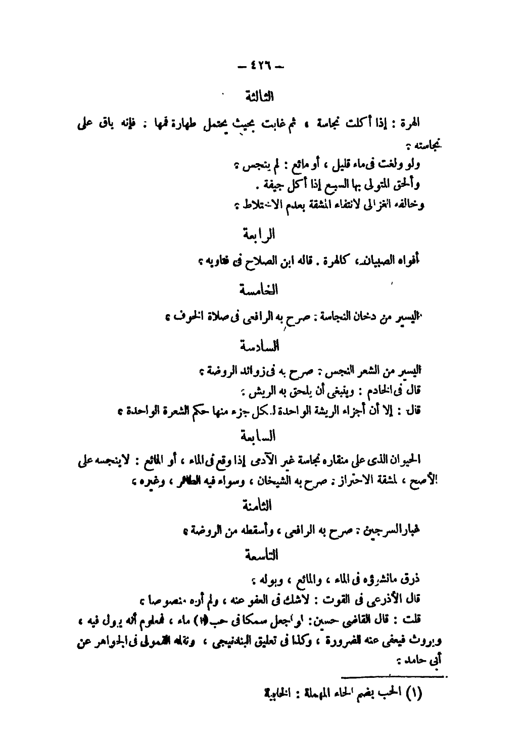 السَّابِعَةُ: الْحَيَوَانُ الَّذِي عَلَى مِنْقَارِهِ نَجَاسَةٌ غَيْرَ الْآدَمِيِّ وَإِذَا وَقَعَ فِي الْمَاءِ أَوْ الْمَائِعِ لَا يُنَجِّسُهُ عَلَى الْأَصَحِّ، لِمَشَقَّةِ الِاحْتِرَازِ. صَرَّحَ بِهِ الشَّيْخَانِ، وَسَوَاءٌ فِيهِ الطَّائِرُ وَغَيْرُهُ.