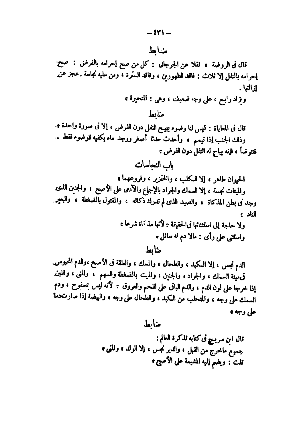 الْحَيَوَانُ طَاهِرٌ إلَّا الْكَلْبَ وَالْخِنْزِيرَ وَفُرُوعَهُمَا وَالْمَيْتَاتُ نَجِسَةٌ إلَّا السَّمَكَ وَالْجَرَادَ بِالْإِجْمَاعِ وَالْآدَمِيَّ عَلَى الْأَصَحِّ وَالْجَنِينَ الَّذِي وُجِدَ فِي بَطْنِ الْمُذَكَّاةِ وَالصَّيْدَ الَّذِي لَمْ تُدْرَكْ ذَكَاتُهُ وَالْمَقْتُولَ بِالضَّغْطَةِ وَالْبَعِيرَ النَّادِّ وَلَا حَاجَةَ إلَى اسْتِثْنَائِهَا فِي الْحَقِيقَةِ ; لِأَنَّهَا مُذَكَّاةٌ شَرْعًا وَاسْتُثْنِيَ عَلَى رَأْيٍ: مَا لَا دَمَ لَهُ سَائِلٌ.