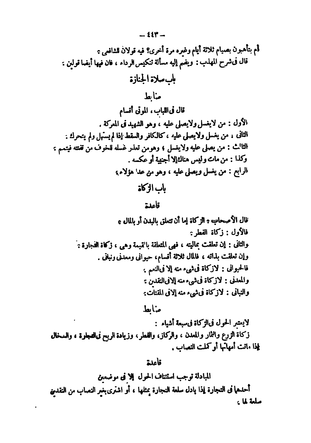 ِ قَاعِدَةٌ قَالَ الْأَصْحَابُ: الزَّكَاةُ إمَّا أَنْ تَتَعَلَّقَ بِالْبَدَنِ أَوْ بِالْمَالِ فَالْأَوَّلُ: زَكَاةُ الْفِطْرِ وَالثَّانِي: إنْ تَعَلَّقَتْ بِمَالِيَّتِهِ، فَهِيَ الْمُتَعَلِّقَةُ بِالْقِيمَةِ وَهِيَ زَكَاةُ التِّجَارَةِ وَإِنْ تَعَلَّقَتْ بِذَاتِهِ فَالْمَالُ ثَلَاثَةُ أَقْسَامِ حَيَوَانِيٌّ وَمَعْدِنِيٌّ وَنَبَاتِيٌّ فَالْحَيَوَانِيُّ: لَا زَكَاةَ فِي شَيْءٍ مِنْهُ إلَّا فِي النَّعَمِ وَالْمَعْدِنِيُّ لَا زَكَاةَ فِي شَيْءٍ مِنْهُ إلَّا فِي النَّقْدَيْنِ وَالنَّبَاتِيُّ: لَا زَكَاةَ فِي شَيْءٍ مِنْهُ إلَّا فِي الْمُقْتَاتِ.