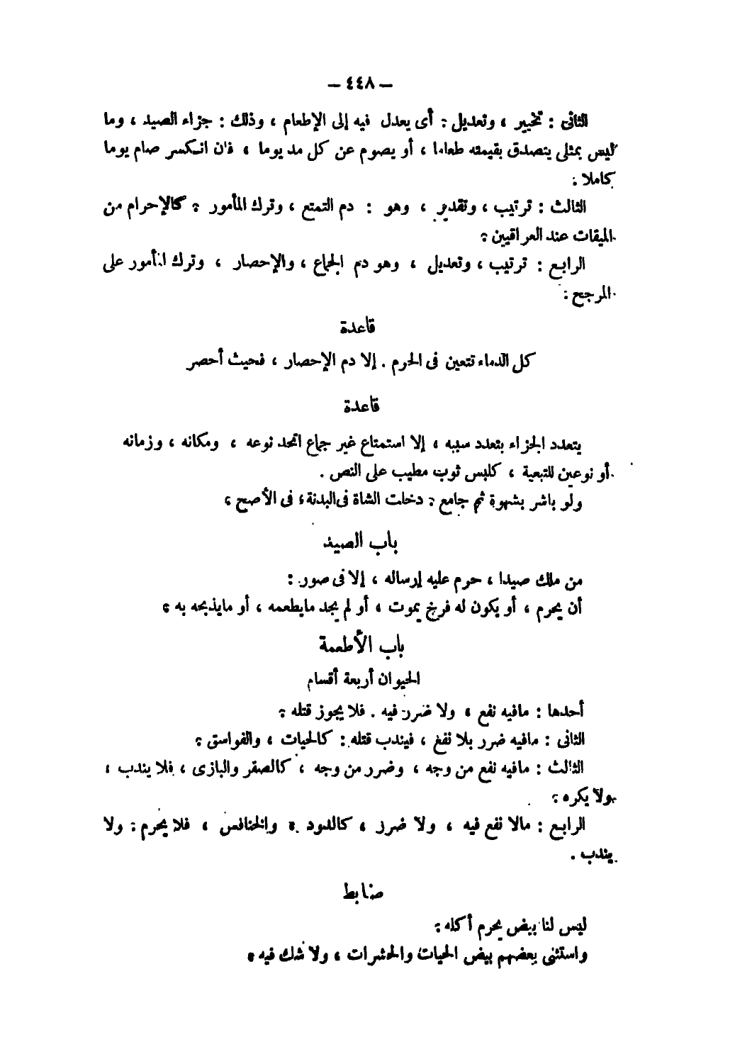 الرَّابِعُ: تَرْتِيبٌ وَتَعْدِيلٌ وَهُوَ دَمُ الْجِمَاعِ وَالْإِحْصَارِ وَتَرْكِ الْمَأْمُورِ عَلَى الْمُرَجَّحِ قَاعِدَةٌ كُلُّ الدِّمَاءِ تَتَعَيَّنُ فِي الْإِحْرَام إلَّا دَمَ الْإِحْصَارِ فَحَيْثُ أُحْصِرَ قَاعِدَةٌ يَتَعَدَّدُ الْجَزَاءُ بِتَعَدُّدِ سَبَبِهِ إلَّا اسْتِمْتَاعًا غَيْرَ جِمَاعٍ اتَّحَدَ نَوْعُهُ وَمَكَانُهُ وَزَمَانُهُ أَوْ نَوْعَيْنِ لِلتَّبَعِيَّةِ كَلُبْسِ ثَوْبٍ مُطَيَّبٍ عَلَى النَّصِّ وَلَوْ بَاشَرَ بِشَهْوَةٍ ثُمَّ جَامَعَ دَخَلَتْ الشَّاةُ فِي الْبَدَنَةِ عَلَى الْأَصَحِّ.