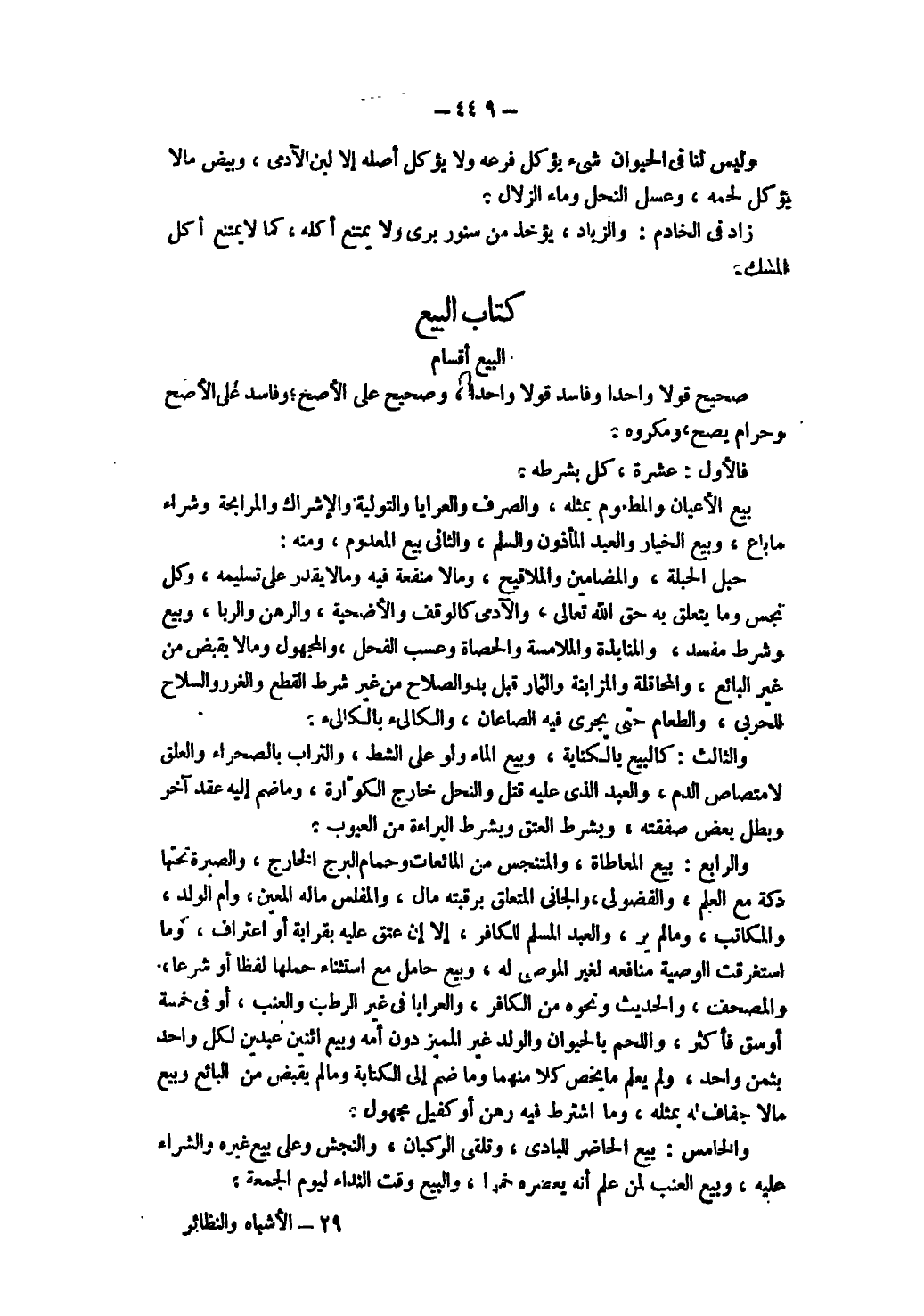 ُ الْبَيْعُ أَقْسَامٌ صَحِيحٌ قَوْلًا وَاحِدًا وَفَاسِدٌ قَوْلًا وَاحِدًا وَصَحِيحٌ عَلَى الْأَصَحِّ وَفَاسِدٌ عَلَى الْأَصَحِّ وَحَرَامٌ يَصِحُّ وَمَكْرُوهٌ فَالْأَوَّلُ: عَشَرَةٌ كُلٌّ بِشَرْطِهِ بَيْعُ الْأَعْيَانِ وَالْمَطْعُومِ بِمِثْلِهِ وَالصَّرْفُ وَالْعَرَايَا وَالتَّوْلِيَةُ وَالْإِشْرَاكُ وَالْمُرَابَحَةُ وَشِرَاءُ مَا بَاعَ وَبَيْعُ الْخِيَارِ وَالْعَبْدِ الْمَأْذُونِ وَالسَّلَمُ وَالثَّانِي بَيْعُ الْمَعْدُومِ وَمِنْهُ حَبَلُ الْحَبَلَةِ وَالْمَضَامِينُ وَالْمَلَاقِيحِ وَمَا لَا مَنْفَعَةَ فِيهِ وَمَا لَا يُقْدَرُ عَلَى تَسْلِيمِهِ وَكُلُّ نَجِسٍ وَمَا يَتَعَلَّقُ بِهِ حَقُّ اللَّهِ تَعَالَى وَالْآدَمِيِّ كَالْوَقْفِ وَالْأُضْحِيَّةِ وَالرَّهْنِ وَالرِّبَا وَبَيْعٌ وَشَرْطٌ مُفْسِدٌ وَالْمُنَابَذَةُ وَالْمُلَامَسَةُ وَالْحَصَاةُ وَعَسْبُ الْفَحْلِ، وَالْمَجْهُولُ، وَمَا لَا يُقْبَضُ مِنْ غَيْرِ الْبَائِعِ وَالْمُحَاقَلَةُ وَالْمُزَابَنَةُ وَالثِّمَارُ قَبْلَ بُدُوِّ الصَّلَاحِ مِنْ غَيْرِ شَرْطِ الْقَطْعِ وَالْغَرَرُ وَالسِّلَاحُ لِلْحَرْبِيِّ وَالطَّعَامُ حَتَّى يَجْرِيَ فِيهِ الصَّاعَانِ وَالْكَالِئُ بِالْكَالِئِ.