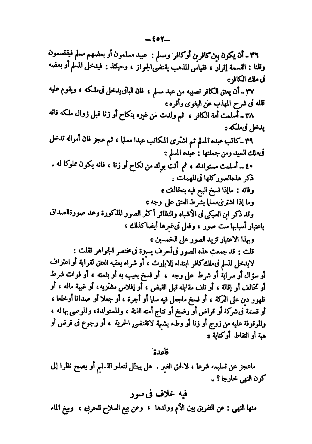 كَاتَبَ عَبْدَهُ الْمُسْلِمَ، ثُمَّ اشْتَرَى الْمُكَاتَبُ عَبْدًا مُسْلِمًا، ثُمَّ عَجَزَ، فَإِنَّ أَمْوَالَهُ تَدْخُلُ فِي مِلْكِ السَّيِّدِ وَمِنْ جُمْلَتِهَا: عَبْدُ الْمُسْلِمِ أَسْلَمَتْ مُسْتَوْلَدَتُهُ ثُمَّ أَتَتْ بِوَلَدٍ مِنْ نِكَاحٍ أَوْ زِنًا، فَإِنَّهُ يَكُونُ مَمْلُوكًا لَهُ ذَكَرَ هَذِهِ الصُّوَرَ كُلَّهَا فِي الْمُهِمَّاتِ وَفَاتَهُ: مَا إذَا فُسِخَ الْبَيْعُ فِيهِ بِتَخَالُفٍ وَمَا إذَا اشْتَرَى مُسْلِمًا بِشَرْطِ الْعِتْقِ عَلَى وَجْهٍ وَقَدْ ذَكَرَ ابْنُ السُّبْكِيّ فِي الْأَشْبَاهِ وَالنَّظَائِرِ أَكْثَرَ الصُّوَرِ الْمَذْكُورَةِ وَعَدَّ صُورَةَ الصَّدَاقِ بِاعْتِبَارِ أَسْبَابِهَا سِتَّ صُوَرٍ وَفَعَلَ فِي غَيْرِهَا أَيْضًا كَذَلِكَ وَبِهَذَا الِاعْتِبَارِ تَزِيدُ الصُّوَرُ عَلَى الْخَمْسِينَ قُلْت: قَدْ جَمَعْت هَذِهِ الصُّوَرَ فِي أَحْرُفٍ يَسِيرَةٍ فِي مُخْتَصَرِ الْجَوَاهِرِ فَقُلْت: لَا يَدْخُلُ الْمُسْلِمُ فِي مِلْكِ كَافِرٍ ابْتِدَاءً إلَّا بِإِرْثٍ أَوْ شِرَاءٍ يَعْقُبُهُ الْعِتْقُ لِقَرَابَةٍ أَوْ اعْتِرَافٍ أَوْ سُؤَالٍ أَوْ سِرَايَةٍ أَوْ شَرْطٍ عَلَى وَجْهٍ أَوْ فَسْخٍ بِعَيْبٍ بِهِ أَوْ بِثَمَنِهِ أَوْ فَوَاتِ شَرْطٍ أَوْ تَخَالُفٍ أَوْ إقَالَةٍ أَوْ تَلَفِ مُقَابِلِهِ قَبْلَ الْقَبْضِ أَوْ إفْلَاسِ مُشْتَرِيهِ أَوْ غَيْبَةِ مَالِهِ أَوْ ظُهُورِ دَيْنٍ عَلَى التَّرِكَةِ أَوْ فَسْخِ مَا جُعِلَ فِيهِ سَلَمًا أَوْ أُجْرَةً أَوْ جُعْلًا أَوْ صَدَاقًا أَوْ خُلْعًا أَوْ قِسْمَةً فِي شَرِكَةٍ أَوْ قِرَاضٍ أَوْ رَضْخٍ أَوْ نِتَاجِ أَمَتِهِ الْقِنَّةِ وَالْمُسْتَوْلَدَةِ وَالْمُوصَى بِهَا لَهُ وَالْمَوْقُوفَةِ عَلَيْهِ مِنْ زَوْجٍ أَوْ زِنًا أَوْ وَطْءٍ بِشُبْهَةٍ لَا تَقْتَضِي الْحُرِّيَّةَ أَوْ رُجُوعٍ فِي قَرْضٍ أَوْ هِبَةٍ أَوْ الْتِقَاطٍ أَوْ كِتَابَةٍ.