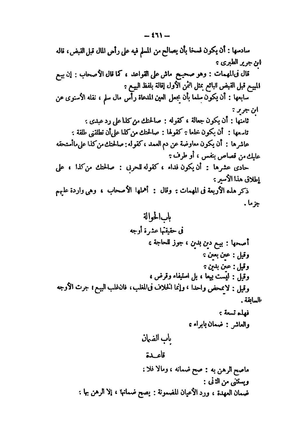 ِ فِي حَقِيقَتِهَا عَشَرَةُ أَوْجُهٍ: أَصَحُّهَا: بَيْعُ دَيْنٍ بِدَيْنٍ، جُوِّزَ لِلْحَاجَةِ. وَقِيلَ: عَيْنٍ بِعَيْنٍ. وَقِيلَ: عَيْنٍ بِدَيْنٍ. وَقِيلَ: لَيْسَتْ بَيْعًا، بَلْ اسْتِيفَاءٌ وَقَرْضٌ. وَقِيلَ: لَا يَمْحَضُ وَاحِدًا، وَإِنَّمَا الْخِلَافُ فِي الْمُغَلَّبِ، فَإِنْ غُلِّبَ الْبَيْعُ جَرَتْ الْأَوْجُهُ السَّابِقَةُ، فَهَذِهِ تِسْعَةٌ. وَالْعَاشِرُ: ضَمَانٌ بِإِبْرَاءٍ.