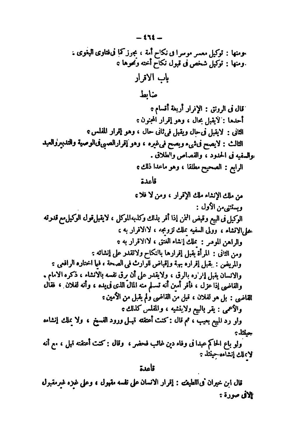 مَنْ مَلَكَ الْإِنْشَاءَ مَلَكَ الْإِقْرَارَ، وَمَنْ لَا فَلَا. وَيُسْتَثْنَى مِنْ الْأَوَّلِ: الْوَكِيلُ فِي الْبَيْعِ وَقَبْضِ الثَّمَنِ إذَا أَقَرَّ بِذَلِكَ وَكَذَّبَهُ الْمُوَكِّلُ، لَا يُقْبَلُ قَوْلُ الْوَكِيلِ مَعَ قُدْرَتِهِ عَلَى الْإِنْشَاءِ وَوَلِيُّ السَّفِيهِ يَمْلِكُ تَزْوِيجَهُ لَا الْإِقْرَارَ بِهِ وَالرَّاهِنُ الْمُوسِرُ: يَمْلِكُ إنْشَاءَ الْعِتْقِ، لَا الْإِقْرَارَ بِهِ.