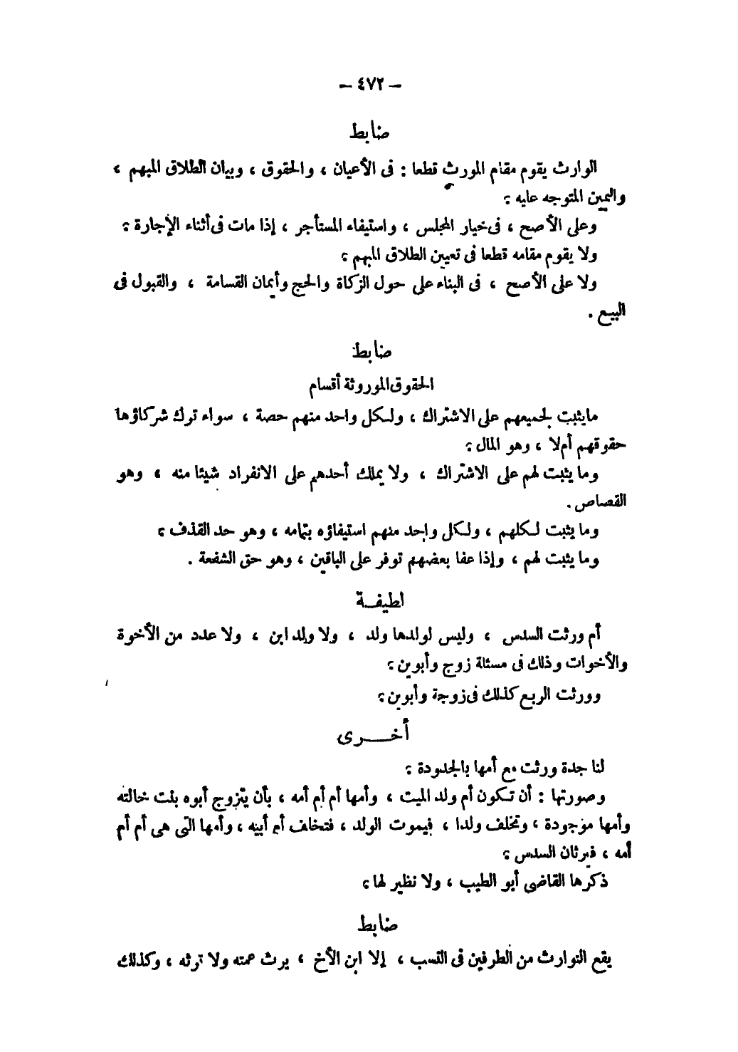 الْحُقُوقُ الْمَوْرُوثَةُ أَقْسَامٌ: مَا يَثْبُتُ لِجَمِيعِهِمْ عَلَى الِاشْتِرَاكِ، وَلِكُلِّ وَاحِدٍ مِنْهُمْ حِصَّةٌ، سَوَاءٌ تَرَكَ شُرَكَاؤُهَا حُقُوقَهُمْ أَمْ لَا، وَهُوَ الْمَالُ. وَمَا يَثْبُتُ لَهُمْ عَلَى الِاشْتِرَاكِ، وَلَا يَمْلِكُ أَحَدُهُمْ عَلَى الِانْفِرَادِ شَيْئًا مِنْهُ، وَهُوَ الْقِصَاصُ. وَمَا يَثْبُتُ لِكُلِّهِمْ، وَلِكُلِّ وَاحِدٍ مِنْهُمْ اسْتِيفَاؤُهُ بِتَمَامِهِ، وَهُوَ حَدُّ الْقَذْفِ. وَمَا يَثْبُتُ لَهُمْ، وَإِذَا عَفَا بَعْضُهُمْ تَوَفَّرَ عَلَى الْبَاقِينَ، وَهُوَ حَقُّ الشُّفْعَةِ.