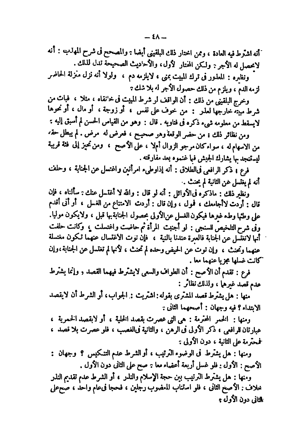 وَمِنْهَا: هَلْ يُشْتَرَطُ فِي الْوُضُوءِ التَّرْتِيبُ، أَوْ الشَّرْطُ عَدَمُ التَّنْكِيسِ؟ وَجْهَانِ: الْأَصَحُّ: الْأَوَّلُ: فَلَوْ غَسَلَ أَرْبَعَةَ أَعْضَاءٍ مَعًا صَحَّ عَلَى الثَّانِي دُونَ الْأَوَّلِ.