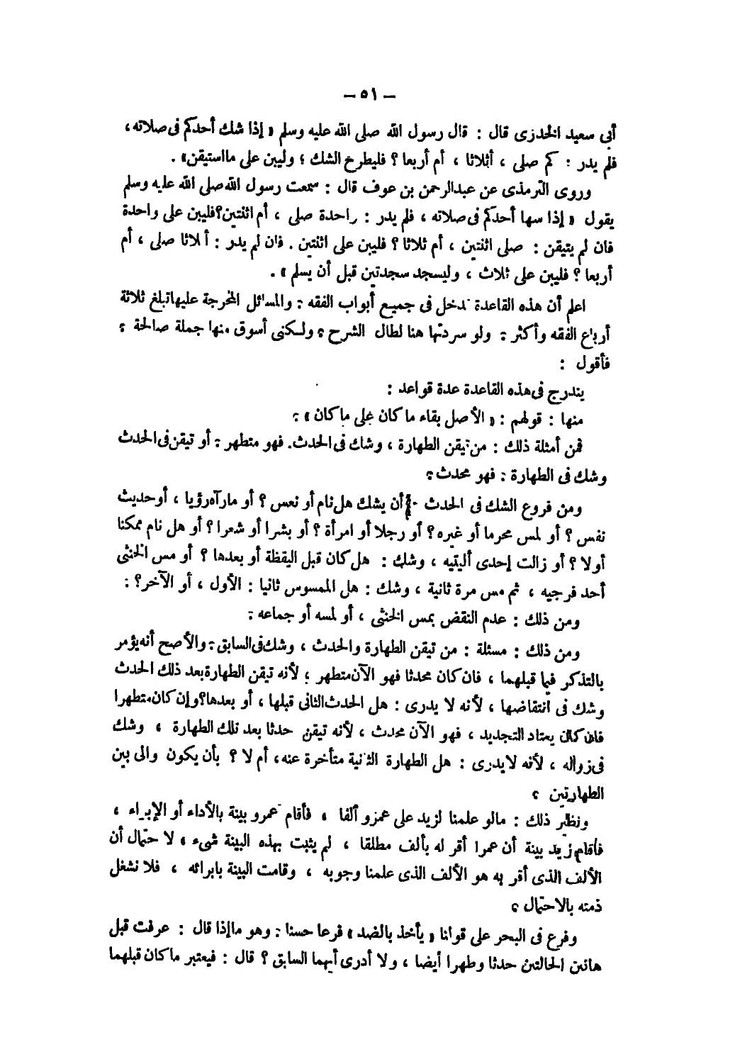 وَمِنْ فُرُوع الشَّكِّ فِي الْحَدَثِ أَنْ يَشُكَّ هَلْ نَامَ أَوْ نَعَسَ؟ أَوْ مَا رَآهُ رُؤْيَا، أَوْ حَدِيثُ نَفْسٍ؟ أَوْ لَمَسَ مُحَرَّمًا أَوْ غَيْرَهُ؟ أَوْ رَجُلًا أَوْ امْرَأَةً؟ أَوْ بَشَرًا أَوْ شَعْرًا؟ أَوْ هَلْ نَامَ مُمَكَّنًا أَوْ لَا؟ أَوْ زَالَتْ إحْدَى أَلْيَتَيْهِ، وَشَكَّ: هَلْ كَانَ قَبْلَ الْيَقَظَةِ أَوْ بَعْدَهَا؟ أَوْ مَسَّ الْخُنْثَى أَحَدَ فَرْجَيْهِ، ثُمَّ مَسَّ مَرَّة ثَانِيَةً وَشَكَّ: هَلْ الْمَمْسُوسُ ثَانِيًا: الْأَوَّلُ، أَوْ الْآخَرُ؟