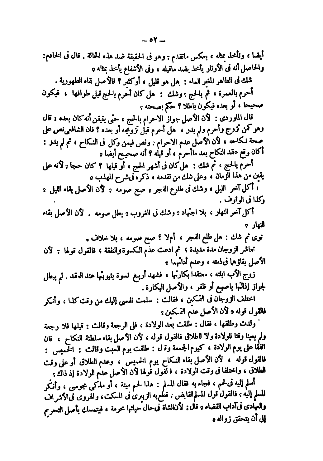 شَكَّ فِي الطَّاهِرِ الْمُغَيِّرِ لِلْمَاءِ: هَلْ هُوَ قَلِيلٌ، أَوْ كَثِيرٌ؟ فَالْأَصْلُ بَقَاءُ الطَّهُورِيَّةِ. أَحْرَمَ بِالْعُمْرَةِ، ثُمَّ بِالْحَجِّ، وَشَكَّ: هَلْ كَانَ أَحْرَمَ بِالْحَجِّ قَبْلَ طَوَافِهَا، فَيَكُونُ صَحِيحًا، أَوْ بَعْدَهُ فَيَكُونُ بَاطِلًا؟ حُكِمَ بِصِحَّتِهِ.