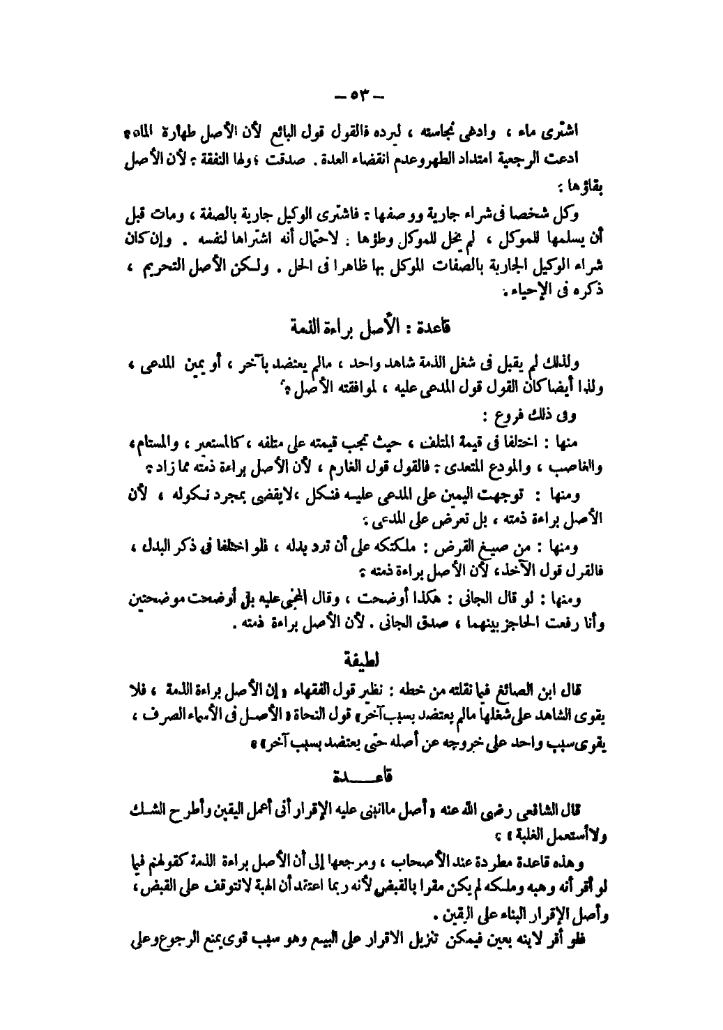 وَهَذِهِ قَاعِدَةٌ مُطَّرِدَةٌ عِنْدَ الْأَصْحَابِ، وَمَرْجِعُهَا إلَى أَنَّ الْأَصْلَ بَرَاءَةُ الذِّمَّةِ، كَقَوْلِهِمْ فِيمَا لَوْ أَقَرَّ أَنَّهُ وَهَبَهُ وَمَلَّكَهُ لَمْ يَكُنْ مُقِرًّا بِالْقَبْضِ لِأَنَّهُ رُبَّمَا اعْتَقَدَ أَنَّ الْهِبَةَ لَا تَتَوَقَّفُ عَلَى الْقَبْضِ، وَأَصْلُ الْإِقْرَارِ الْبِنَاءُ عَلَى الْيَقِينِ.